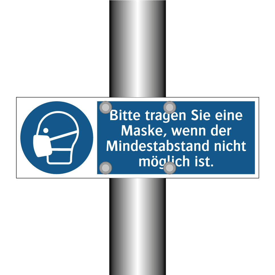 Gebotsschild mit dem Text Bitte tragen Sie eine Maske, wenn der Mindestabstand nicht möglich ist.