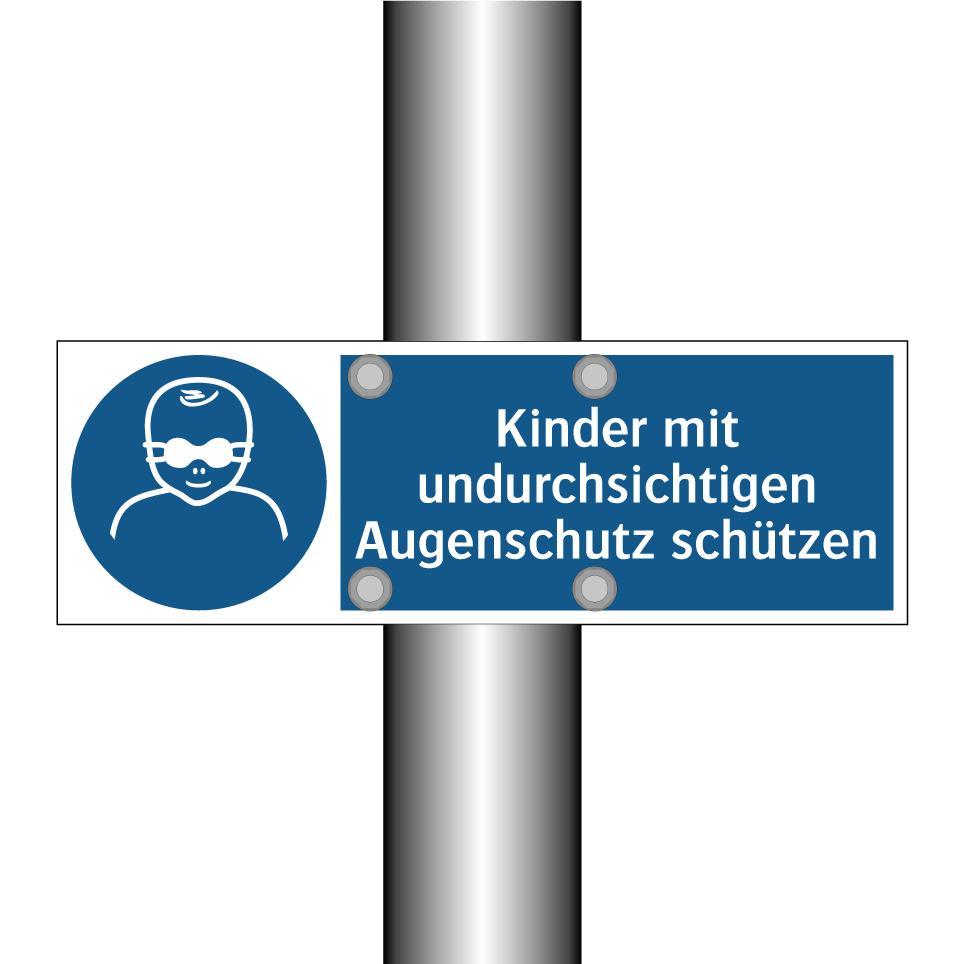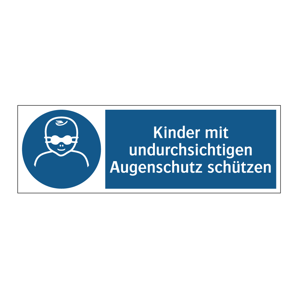 Gebotsschild mit dem Text Kinder mit undurchsichtigen Augenschutz schützen