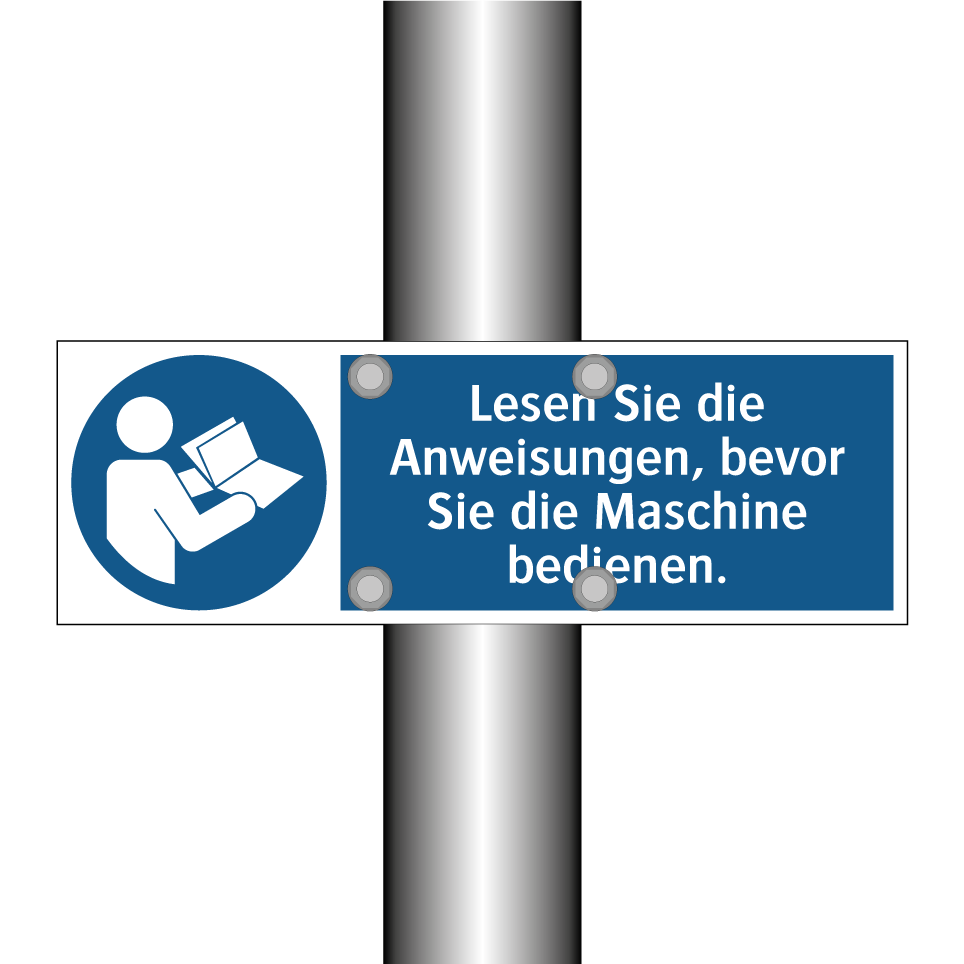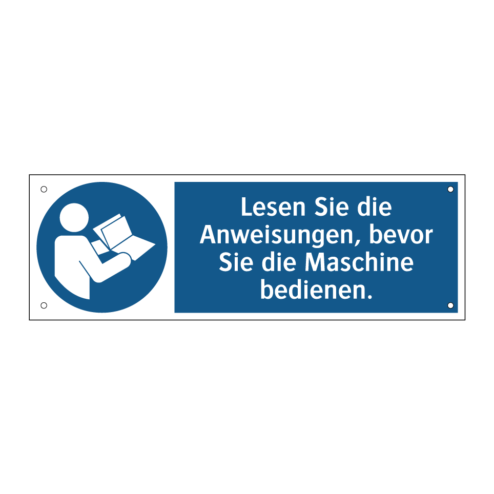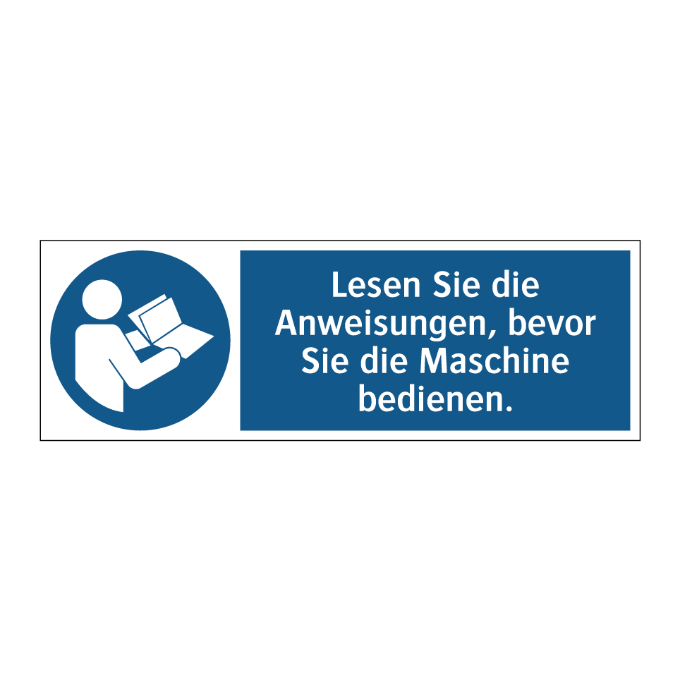 Gebotsschild mit dem Text Lesen Sie die Anweisungen, bevor Sie die Maschine bedienen.