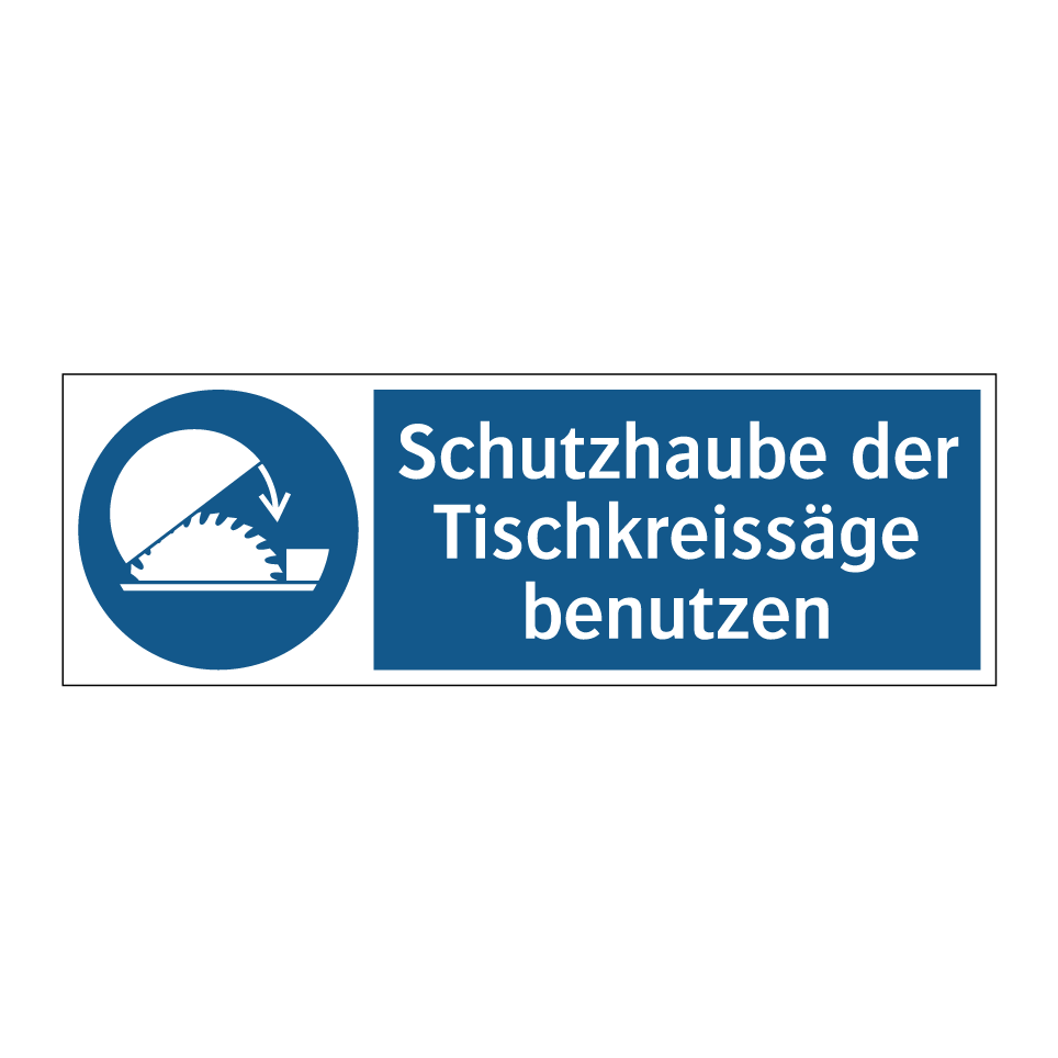 Gebotsschild mit dem Text Schutzhaube der Tischkreissäge benutzen