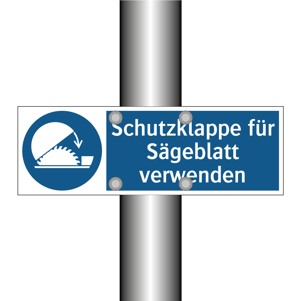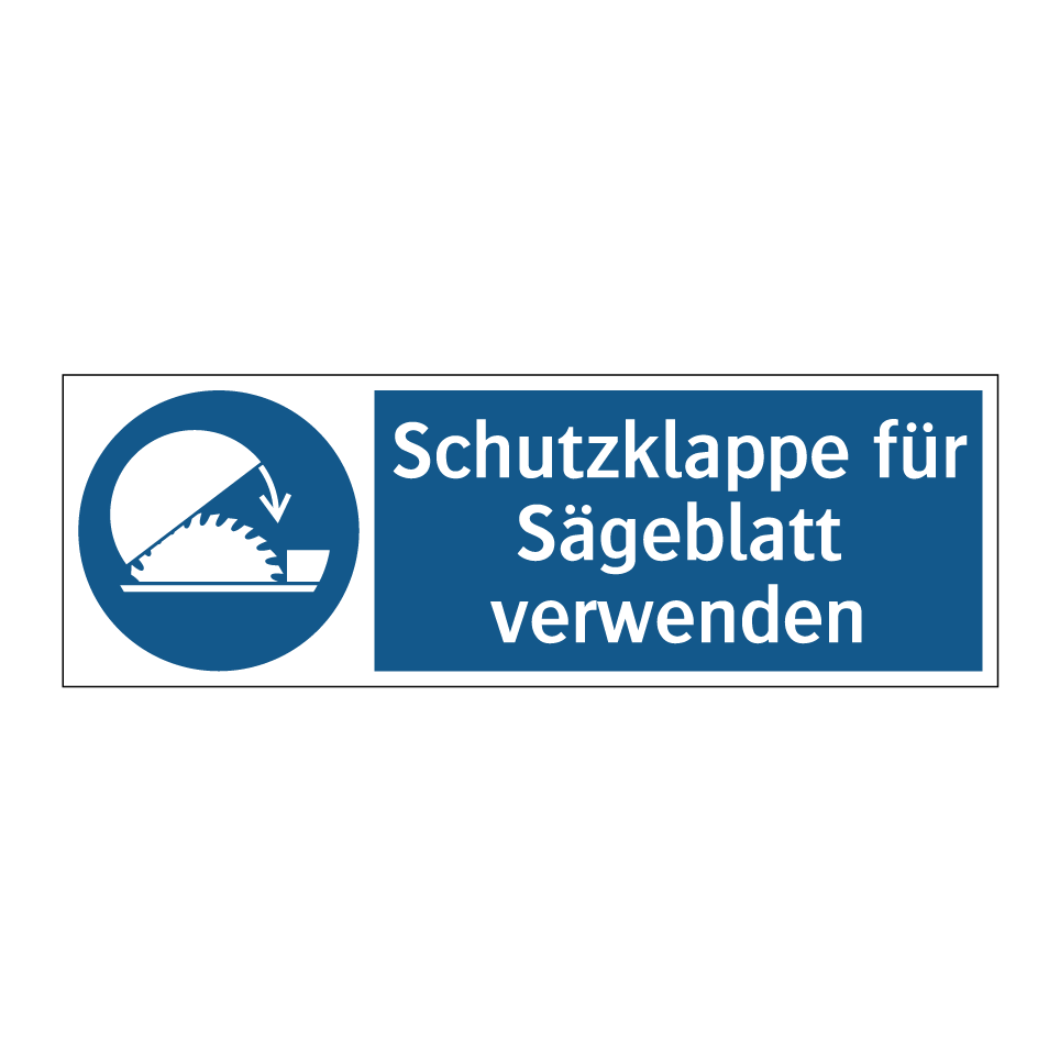 Gebotsschild mit dem Text Schutzklappe für Sägeblatt verwenden