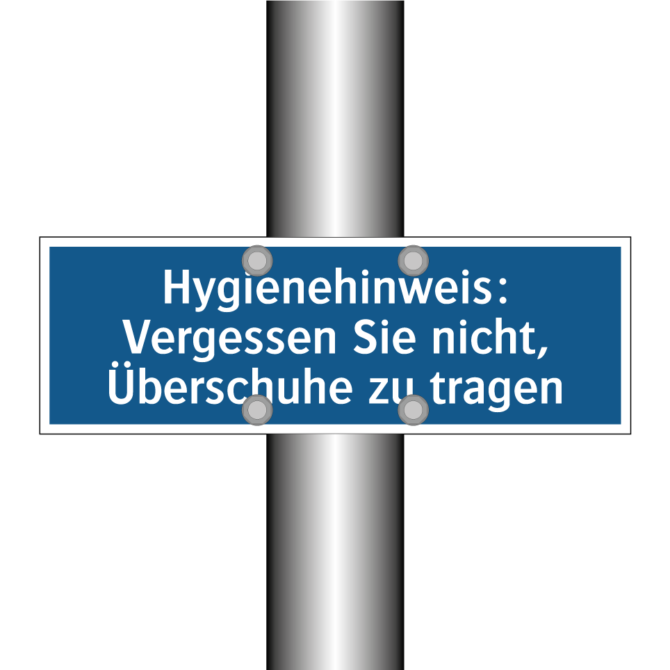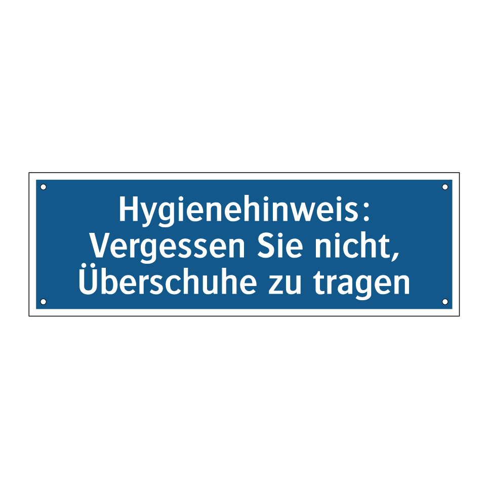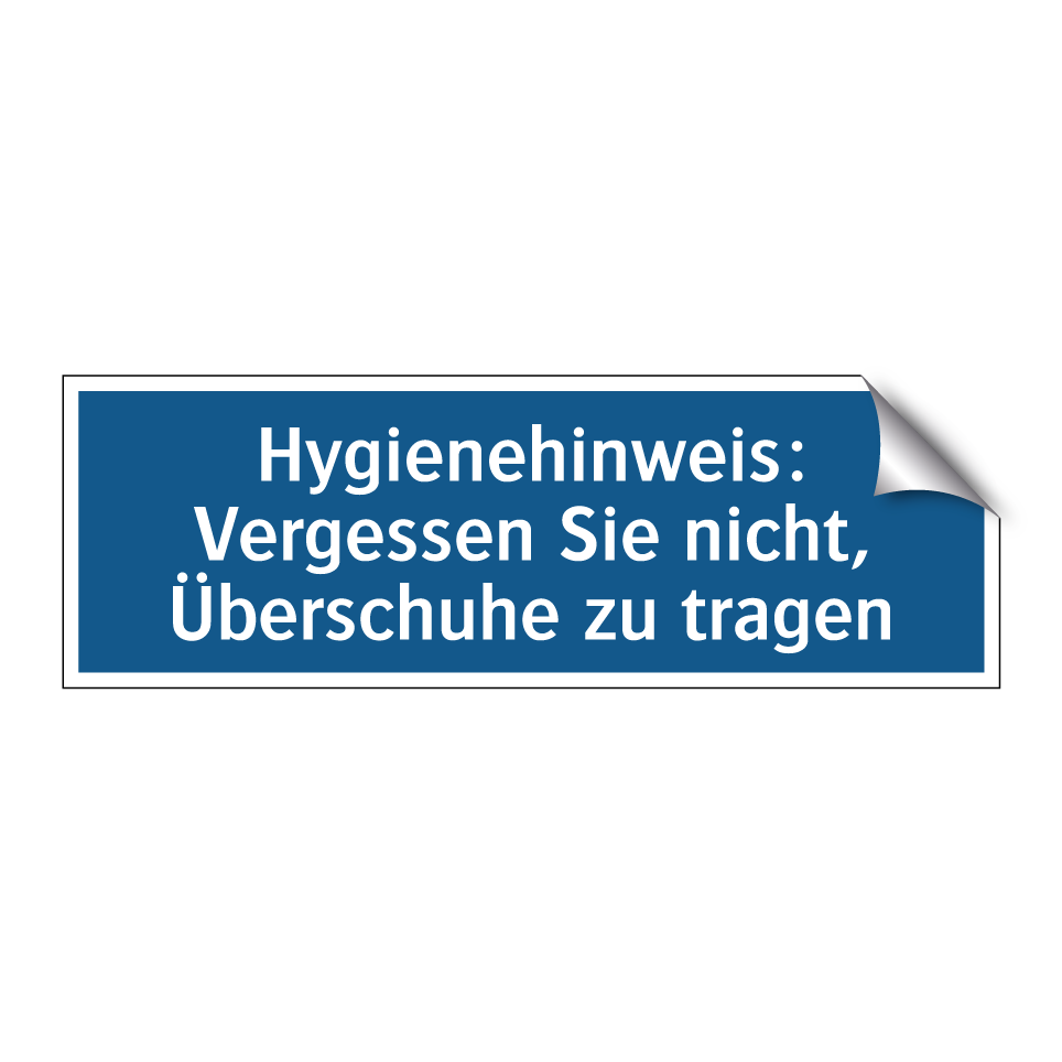 Gebotsschild mit dem Text Hygienehinweis: Vergessen Sie nicht, Überschuhe zu tragen
