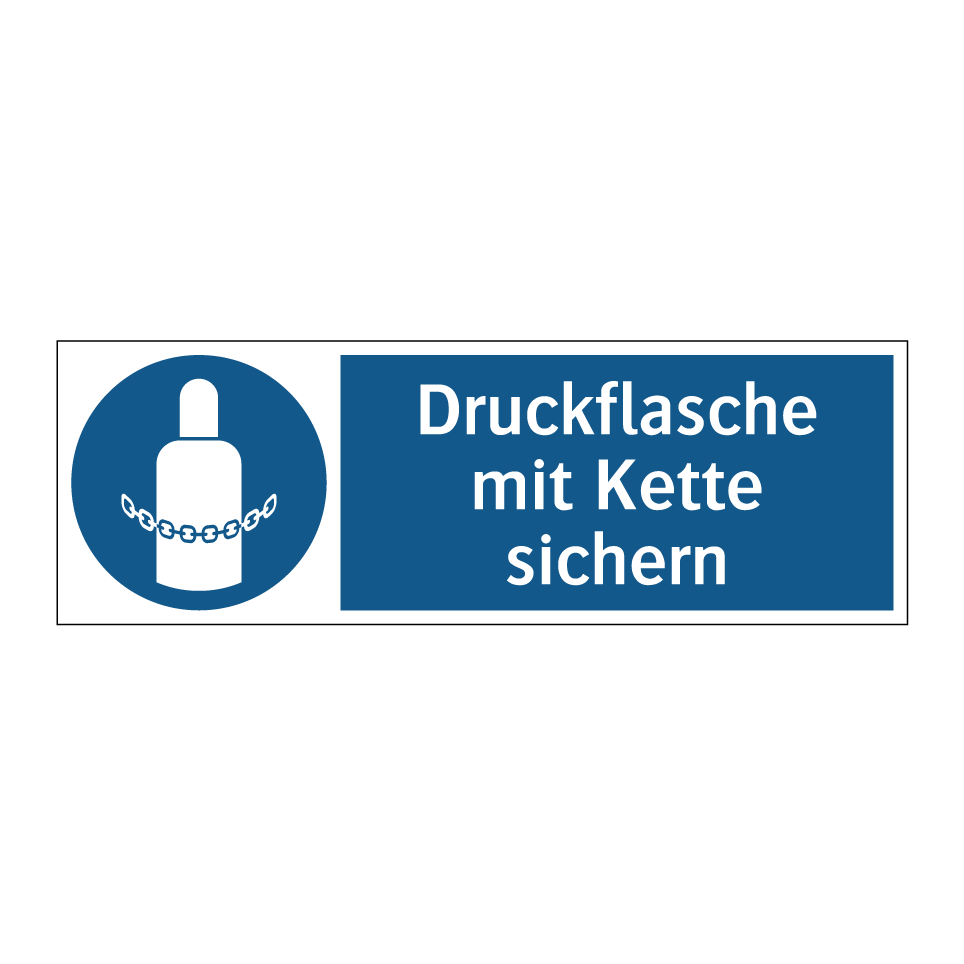 Gebotsschild mit dem Text Druckflasche mit Kette sichern