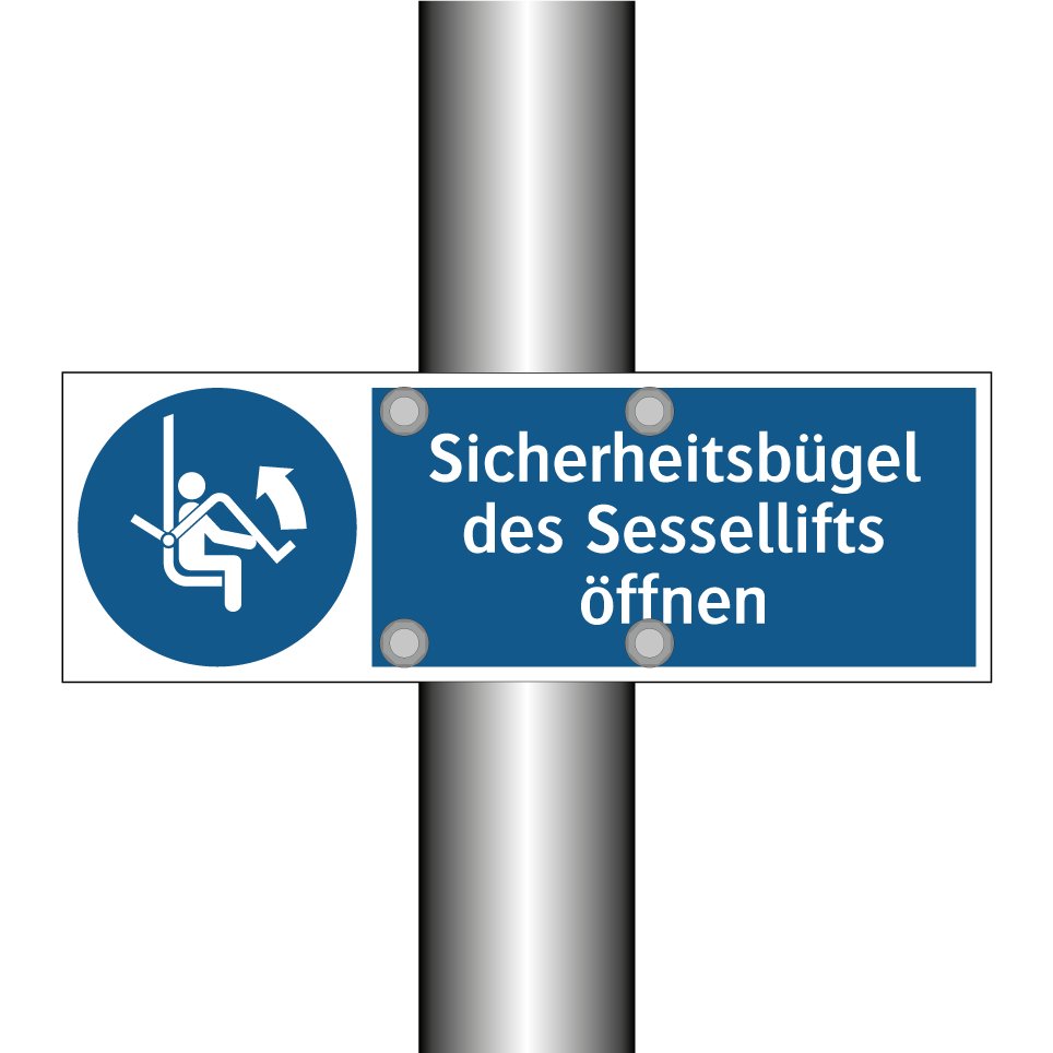 Gebotsschild mit dem Text Sicherheitsbügel des Sessellifts öffnen