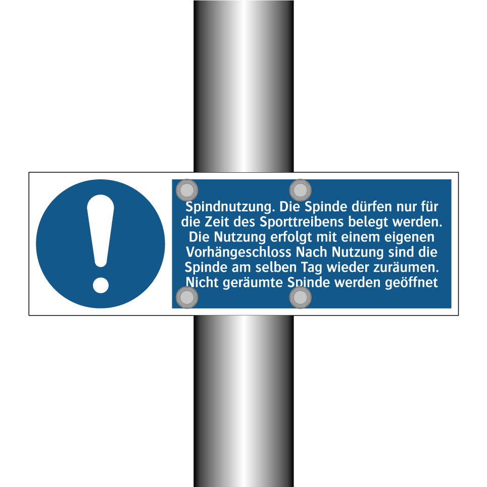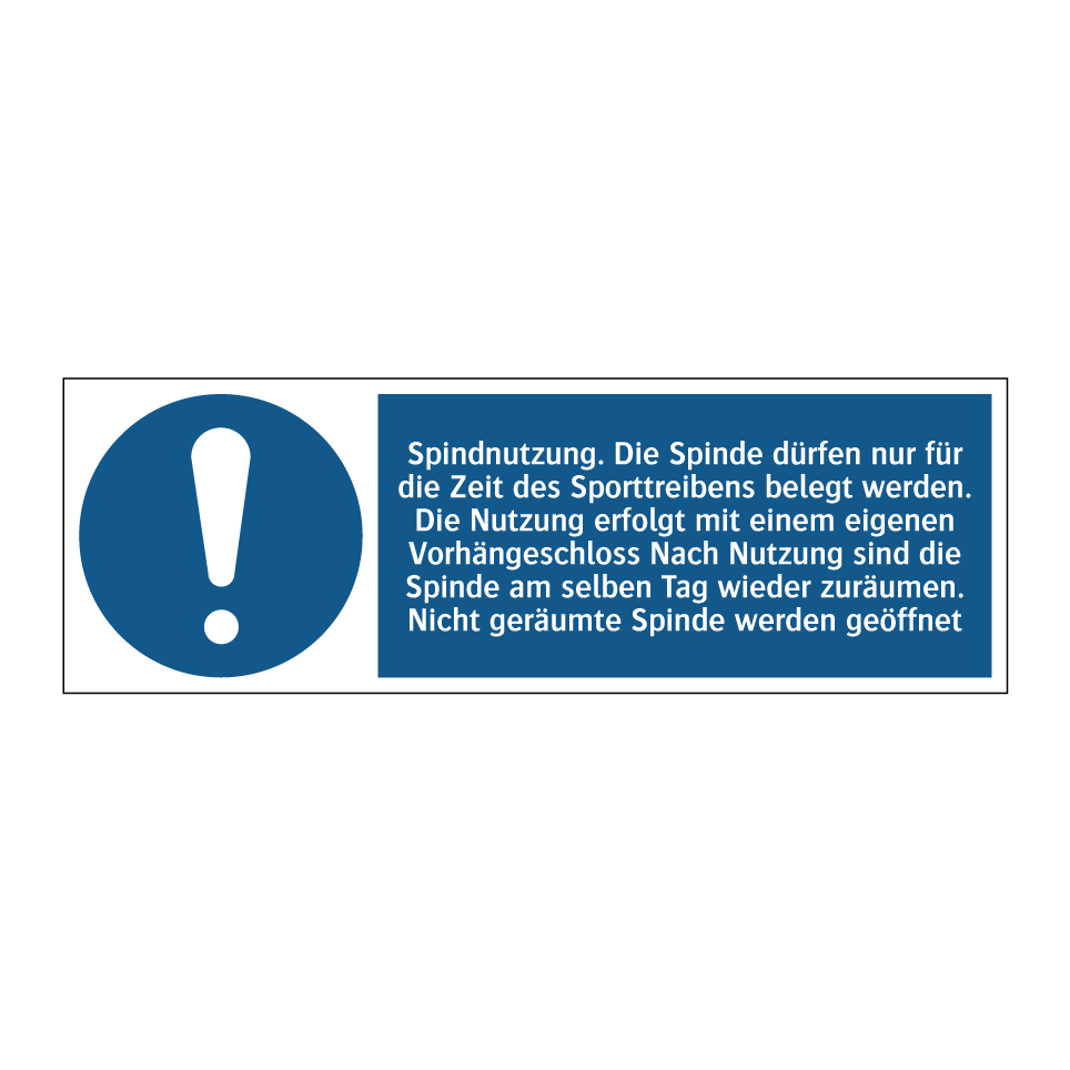 Gebotsschild mit dem Text Spindnutzung. Die Spinde dürfen nur für die Zeit des Sporttreibens belegt werden. Die Nutzung erfolgt mit einem eigenen Vorhängeschloss Nach Nutzung sind die Spinde am selben Tag wieder zuräumen. Nicht geräumte Spinde werden geöffnet