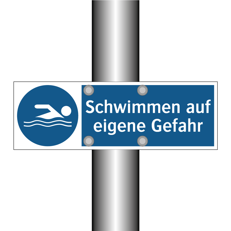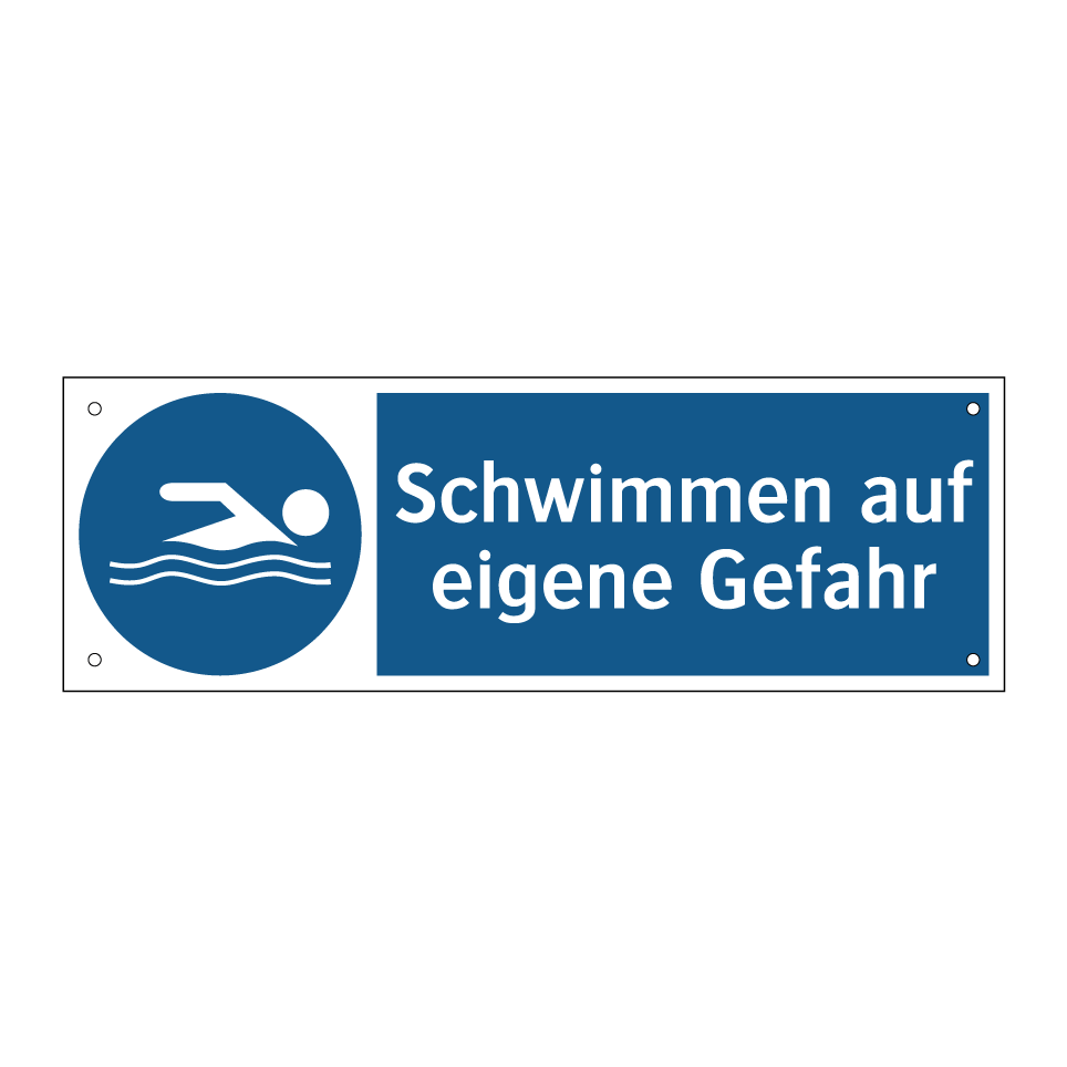 Diese Gebotsschild mit blauem Hintergrund und weißer Schrift ist ideal für Schwimmbäder, Seen oder andere Wasserbereiche, wo das Schwimmen auf eigene Verantwortung erfolgt. Die klare Symbolik und der prägnante Text machen sie unverzichtbar für Orte, an denen Sicherheitshinweise erforderlich sind. Diese Beschilderung erinnert Schwimmer daran, dass sie selbst für ihre Sicherheit verantwortlich sind, und fördert somit ein bewusstes Verhalten im Wasser. Platzieren Sie diese Gebotsschild an gut sichtbaren Stellen wie Eingängen, Umkleidekabinen oder in der Nähe von Wasserzugängen, um sicherzustellen, dass alle Besucher die wichtigen Informationen wahrnehmen.