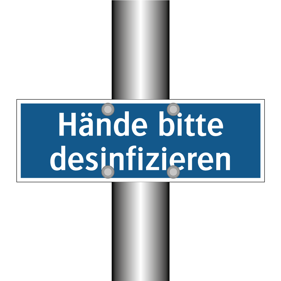 Gebotsschild mit dem Text Hände bitte desinfizieren