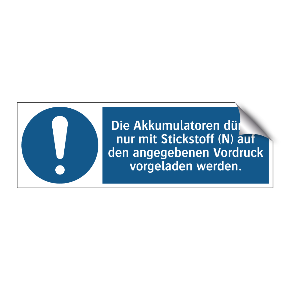 Gebotsschild mit dem Text Die Akkumulatoren dürfen nur mit Stickstoff (N) auf den angegebenen Vordruck vorgeladen werden.