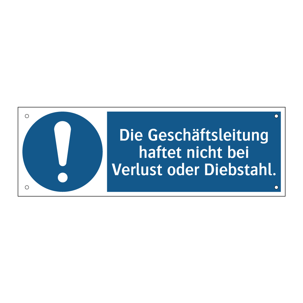Gebotsschild mit dem Text Die Geschäftsleitung haftet nicht bei Verlust oder Diebstahl.