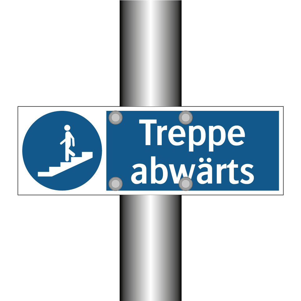 Diese Gebotsschild mit blauem Hintergrund und weißer Schrift ist ideal für den Einsatz in Bereichen, in denen eine klare Anweisung erforderlich ist. Sie weist darauf hin, dass eine Treppe nach unten führt, und ist somit perfekt für Treppenhäuser, öffentliche Gebäude oder Arbeitsstätten geeignet. Die deutliche Symbolik sorgt dafür, dass die Botschaft sofort verstanden wird, was die Sicherheit erhöht. Platzieren Sie diese Gebotsschilder an strategischen Punkten, um den Verkehrsfluss zu lenken und Unfälle zu vermeiden. Ob in Bürogebäuden, Einkaufszentren oder Schulen, diese Beschilderung ist ein unverzichtbares Element für eine sichere Umgebung.