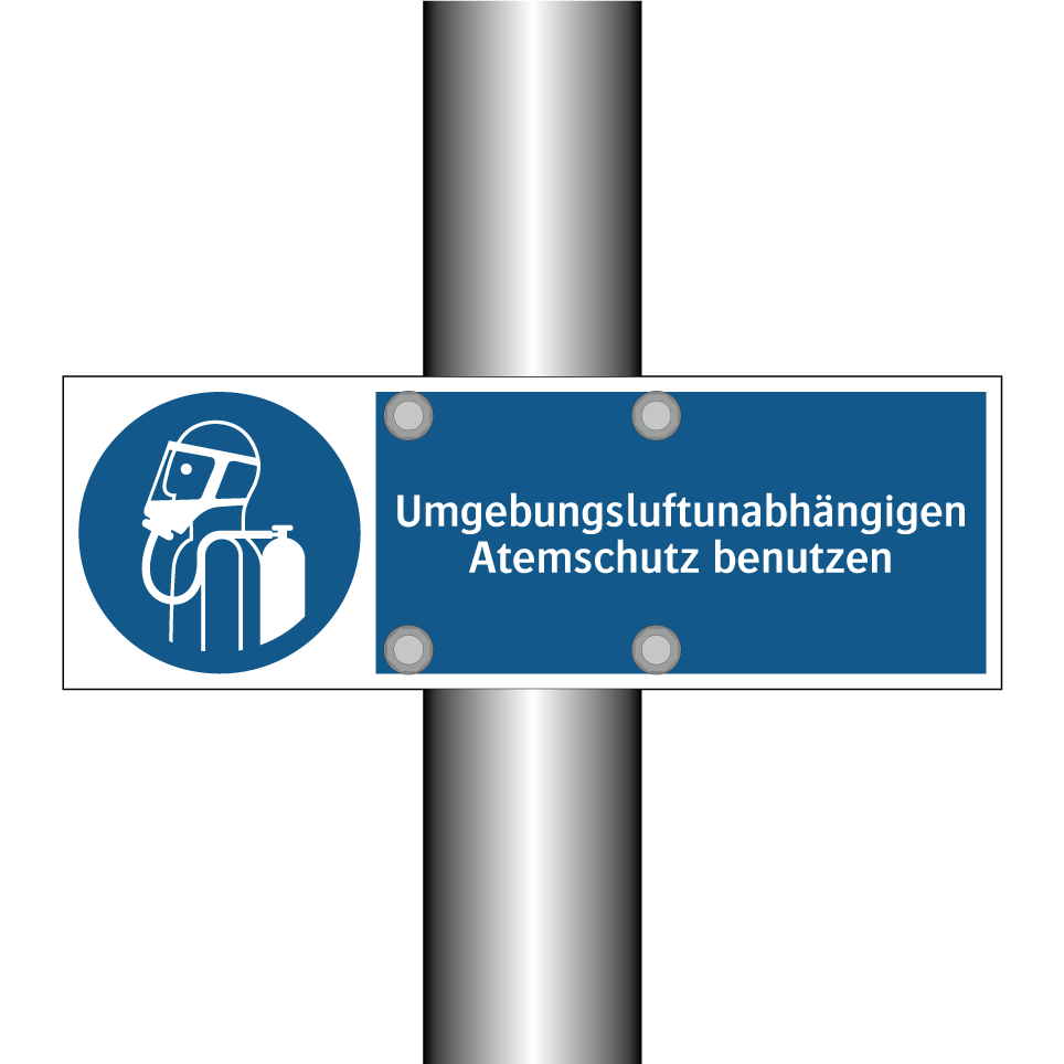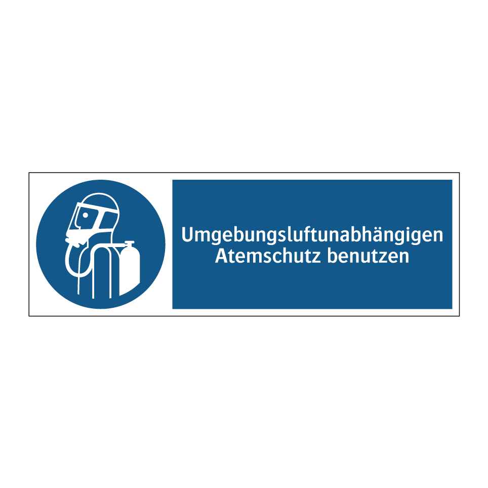 Gebotsschild mit dem Text Umgebungsluftunabhängigen Atemschutz benutzen
