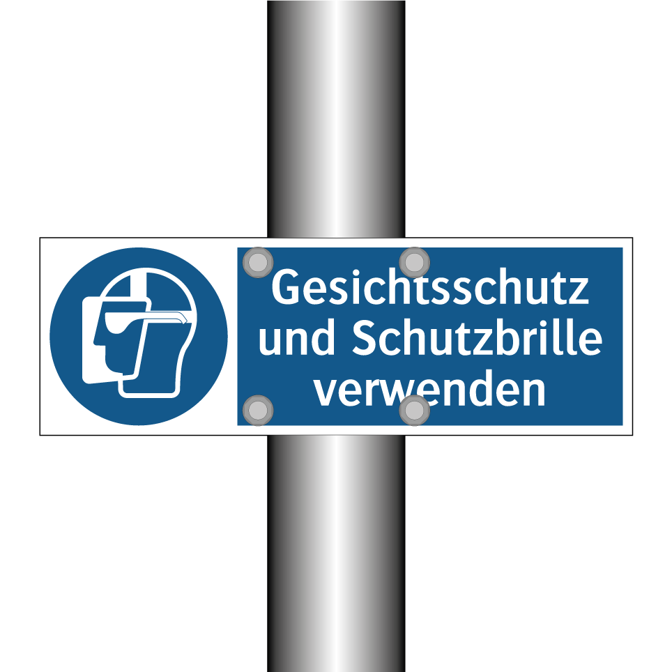 Gebotsschild mit dem Text Gesichtsschutz und Schutzbrille verwenden