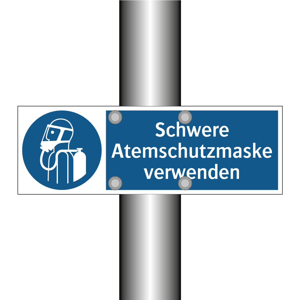 Gebotsschild mit dem Text Schwere Atemschutzmaske verwenden