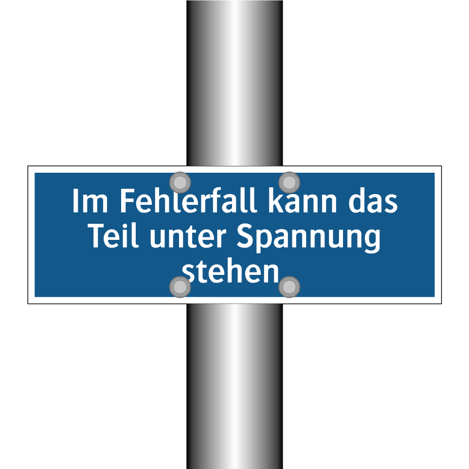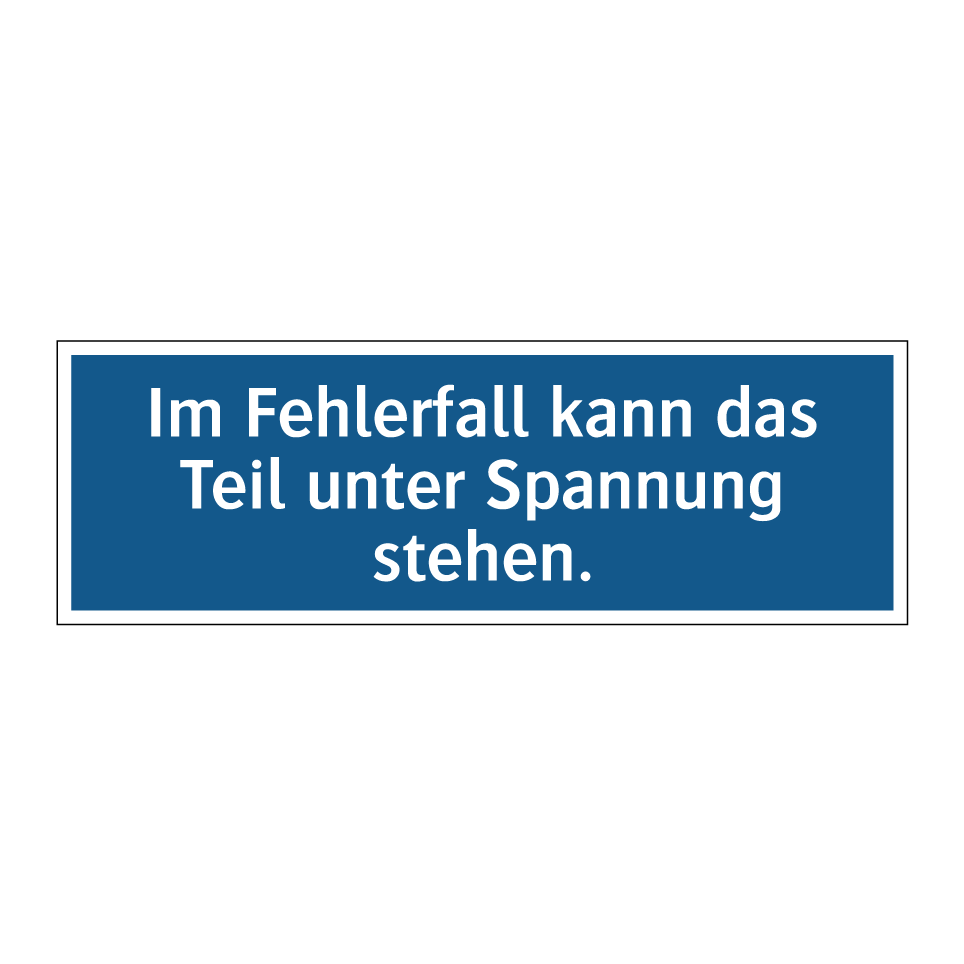 Gebotsschild mit dem Text Im Fehlerfall kann das Teil unter Spannung stehen.