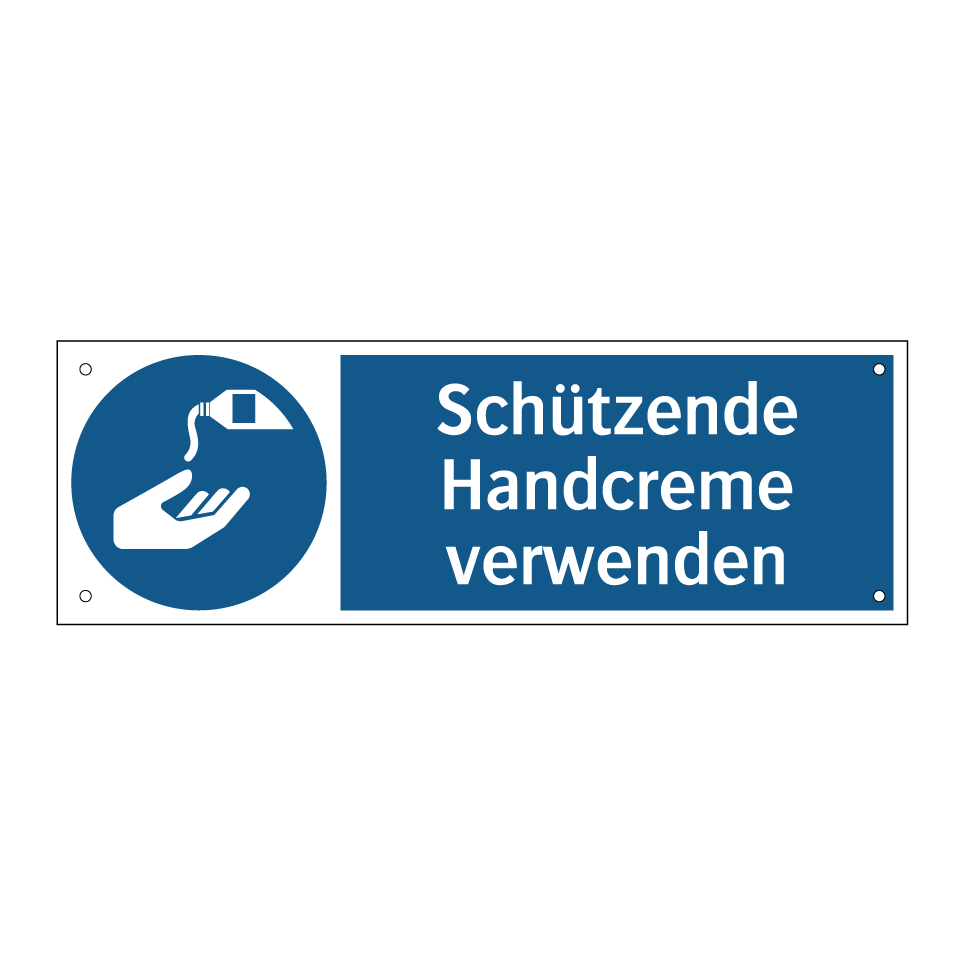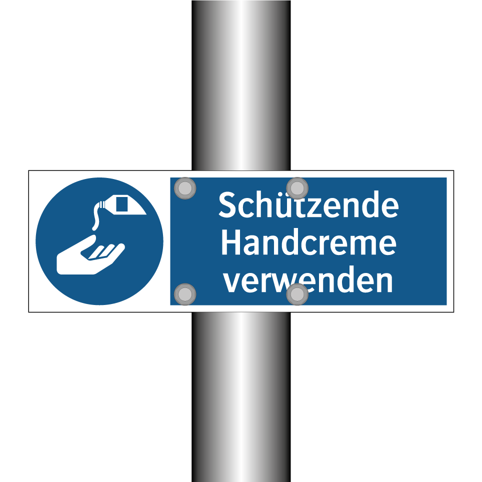Gebotsschild mit dem Text Schützende Handcreme verwenden