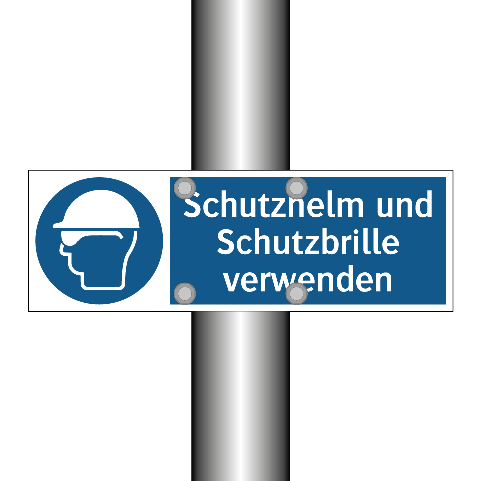 Gebotsschild mit dem Text Schutzhelm und Schutzbrille verwenden