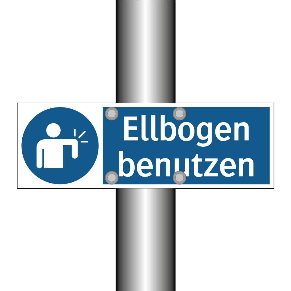 Diese Gebotsschild mit blauem Hintergrund und weißem Text ist ideal für den Einsatz in Bereichen, in denen Hygiene oberste Priorität hat. Perfekt geeignet für Krankenhäuser, Arztpraxen, Laboratorien und andere medizinische Einrichtungen, erinnert sie daran, den Ellbogen zu benutzen, um die Verbreitung von Keimen zu minimieren. Auch in Büros, Schulen und öffentlichen Gebäuden kann diese Gebotsschild effektiv eingesetzt werden, um die Gesundheit und Sicherheit der Besucher und Mitarbeiter zu gewährleisten. Die klare Symbolik und der prägnante Text machen sie leicht verständlich und fördern ein verantwortungsbewusstes Verhalten in stark frequentierten Bereichen.