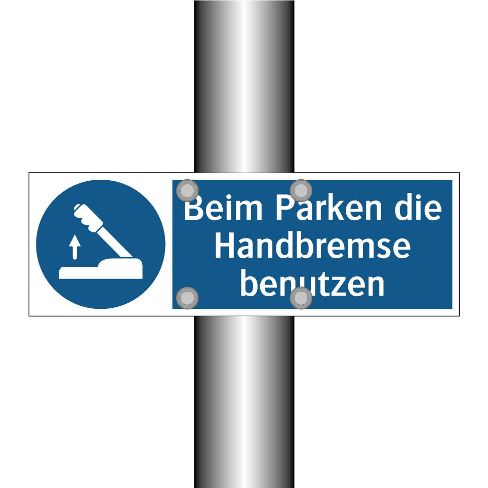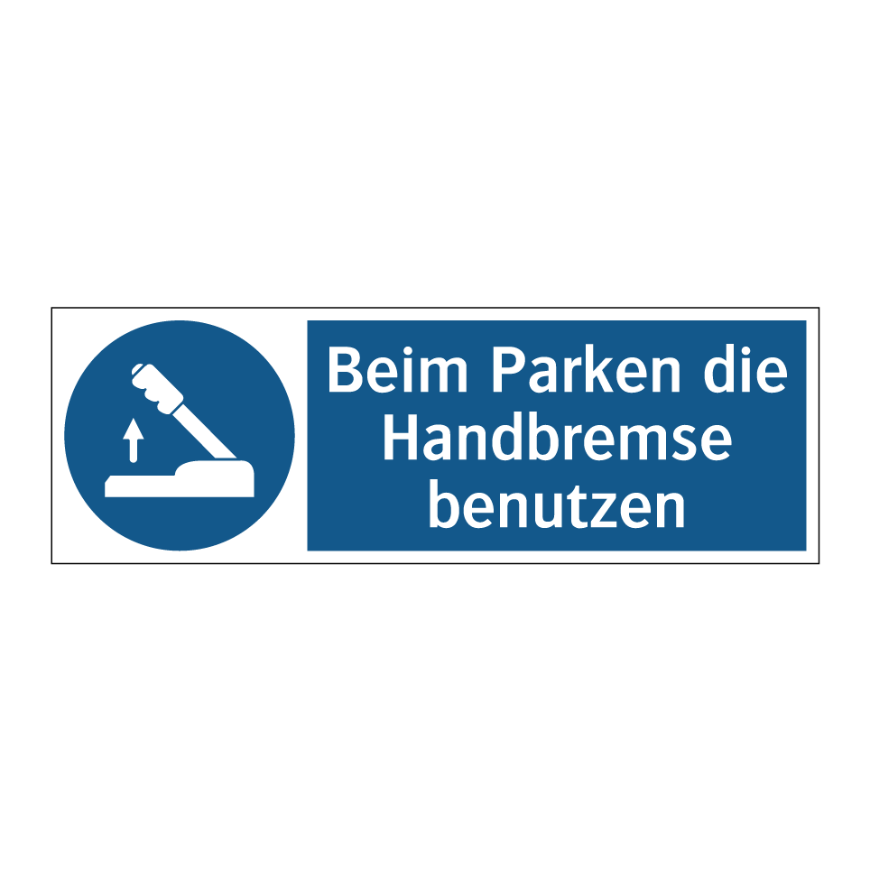 Gebotsschild mit dem Text Beim Parken die Handbremse benutzen