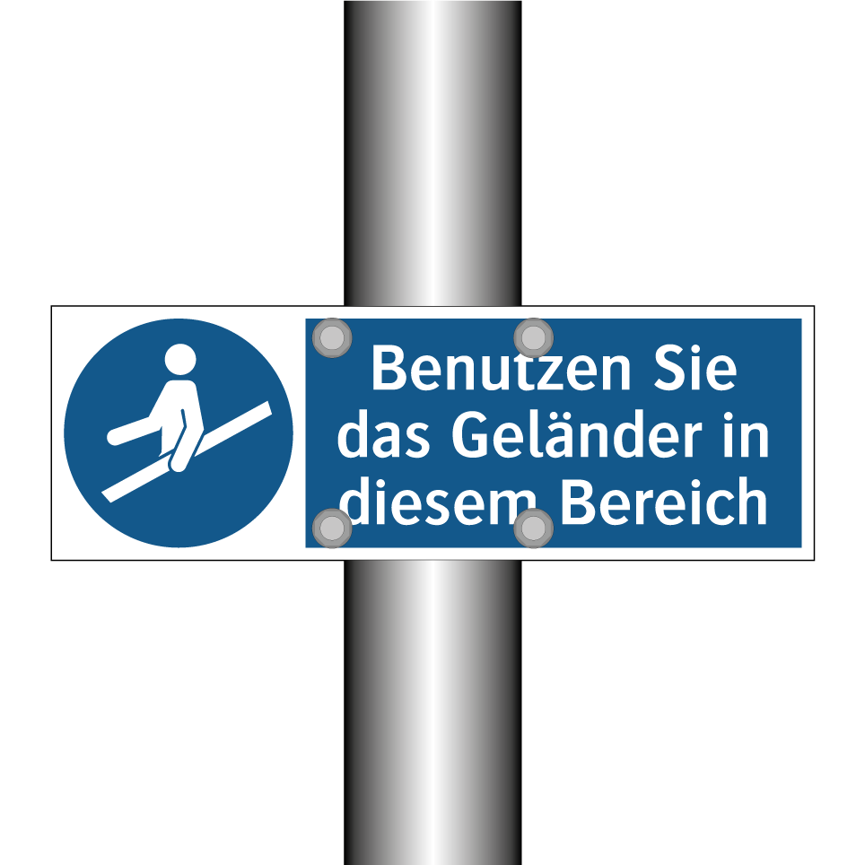 Gebotsschild mit dem Text Benutzen Sie das Geländer in diesem Bereich