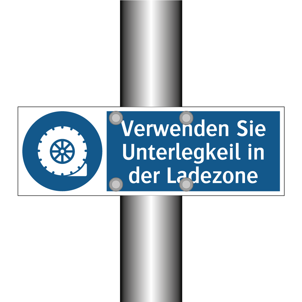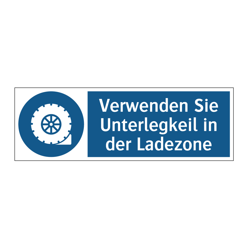 Gebotsschild mit dem Text Verwenden Sie Unterlegkeil in der Ladezone