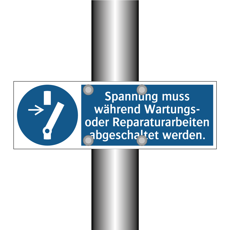 Gebotsschild mit dem Text Spannung muss während Wartungs- oder Reparaturarbeiten abgeschaltet werden.