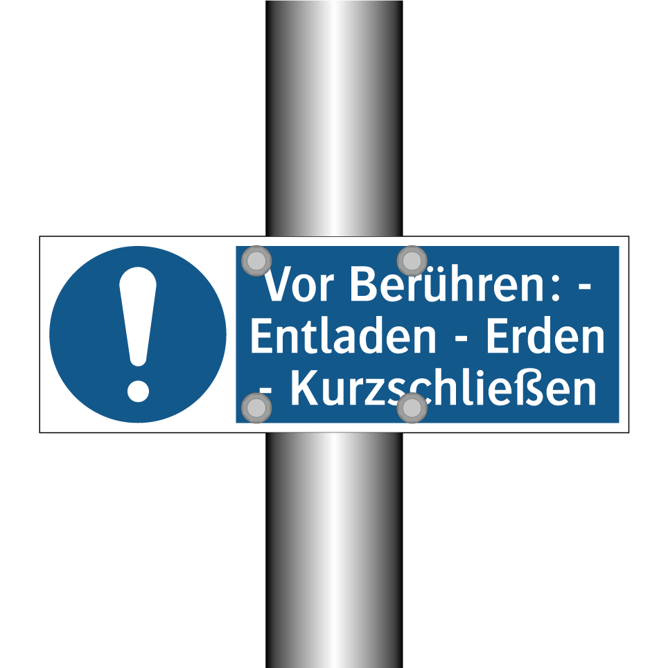 Gebotsschild mit dem Text Vor Berühren: - Entladen - Erden - Kurzschließen