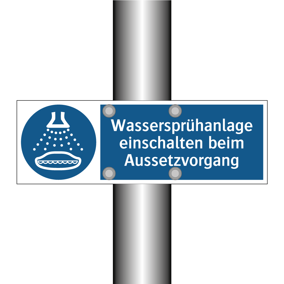 Gebotsschild mit dem Text Wassersprühanlage einschalten beim Aussetzvorgang