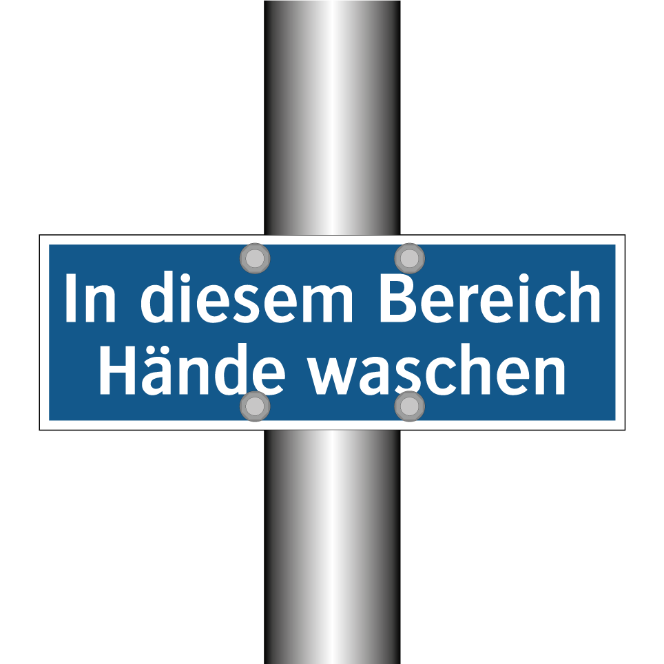 Gebotsschild mit dem Text In diesem Bereich Hände waschen