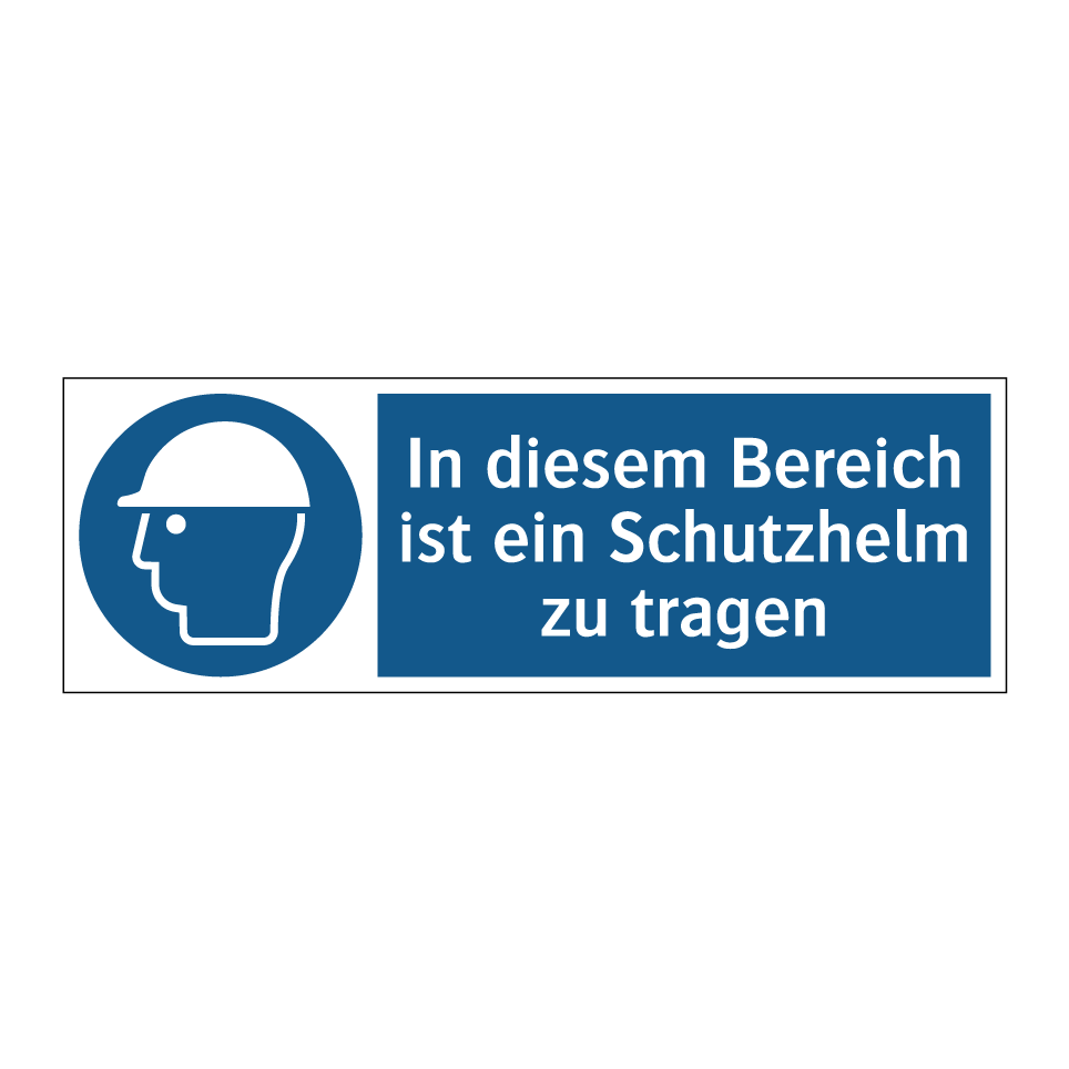 Gebotsschild mit dem Text In diesem Bereich ist ein Schutzhelm zu tragen