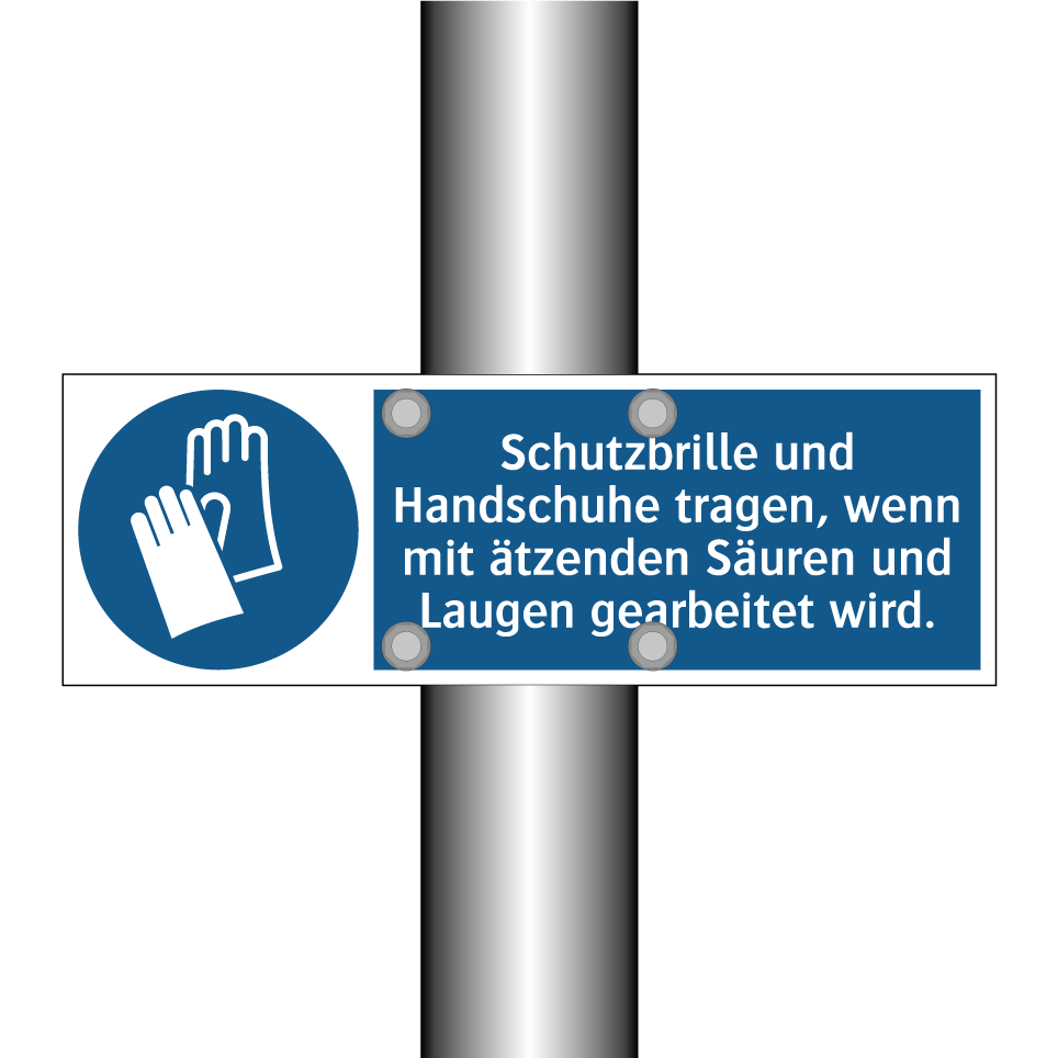 Gebotsschild mit dem Text Schutzbrille und Handschuhe tragen, wenn mit ätzenden Säuren und Laugen gearbeitet wird.