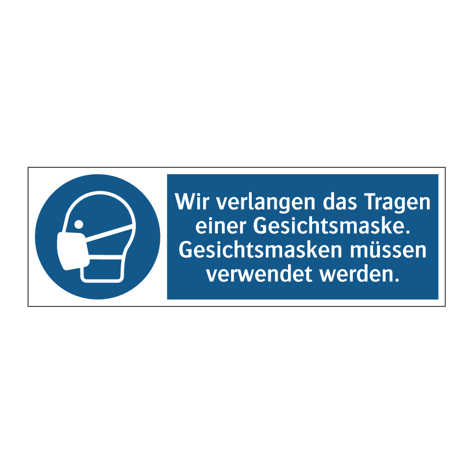 Diese Gebotsschild mit blauer Hintergrundfarbe und weißer Schrift ist ideal für den Einsatz in Bereichen, in denen das Tragen von Gesichtsmasken obligatorisch ist. Die klare Symbolik und der prägnante Text machen sie unverzichtbar in öffentlichen Einrichtungen wie Krankenhäusern, Büros und Einkaufszentren. Sie dient als ständige Erinnerung an die Notwendigkeit, eine Maske zu tragen, um die Sicherheit und Gesundheit aller zu gewährleisten. Platzieren Sie diese Gebotsschild an Eingängen, in Wartebereichen oder an anderen strategischen Punkten, um sicherzustellen, dass die Botschaft effektiv kommuniziert wird. Diese visuelle Aufforderung unterstützt die Einhaltung von Hygienemaßnahmen und fördert ein sicheres Umfeld.
