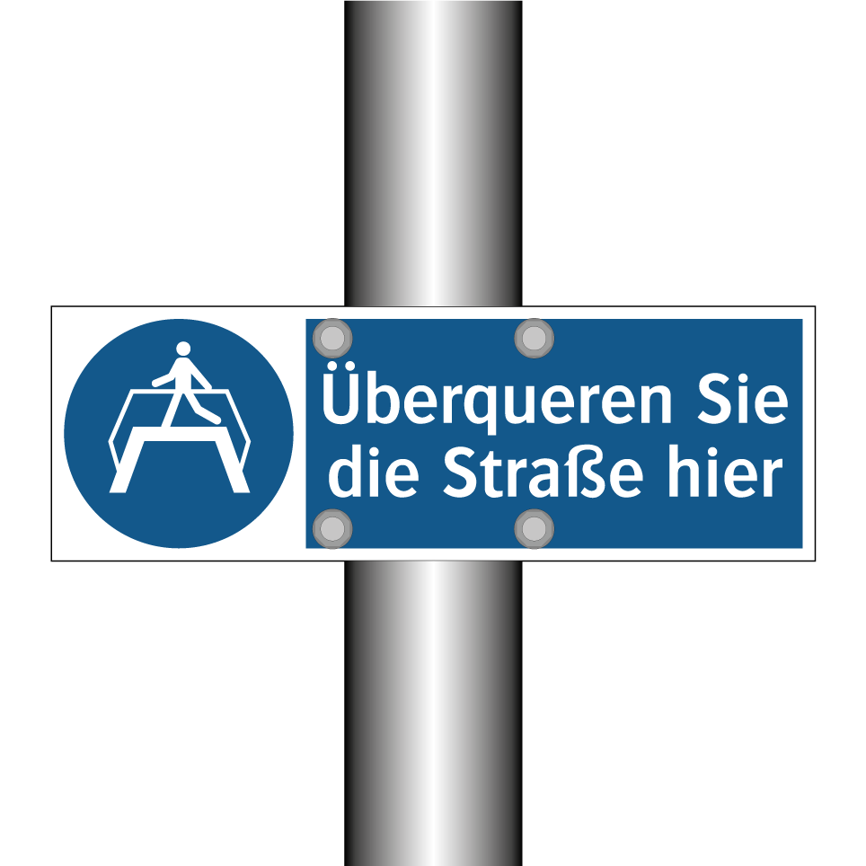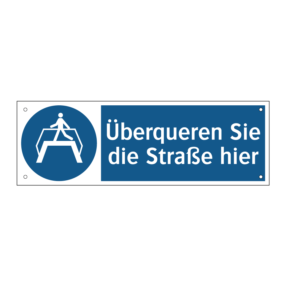 Diese Gebotsschild mit blauem Hintergrund und weißer Schrift ist ideal für die sichere Überquerung von Straßen. Sie weist Fußgänger darauf hin, den Übergang an der vorgesehenen Stelle zu nutzen, um Unfälle zu vermeiden. Diese Verkehrsschild kann an stark frequentierten Straßen, in der Nähe von Schulen oder an Kreuzungen angebracht werden, um die Sicherheit zu erhöhen. Die klare Symbolik und der prägnante Text machen sie leicht verständlich, selbst aus der Ferne. Nutzen Sie diese Gebotsschilder, um den Verkehrsfluss zu optimieren und die Aufmerksamkeit der Passanten zu lenken. Perfekt für städtische Gebiete und öffentliche Plätze.