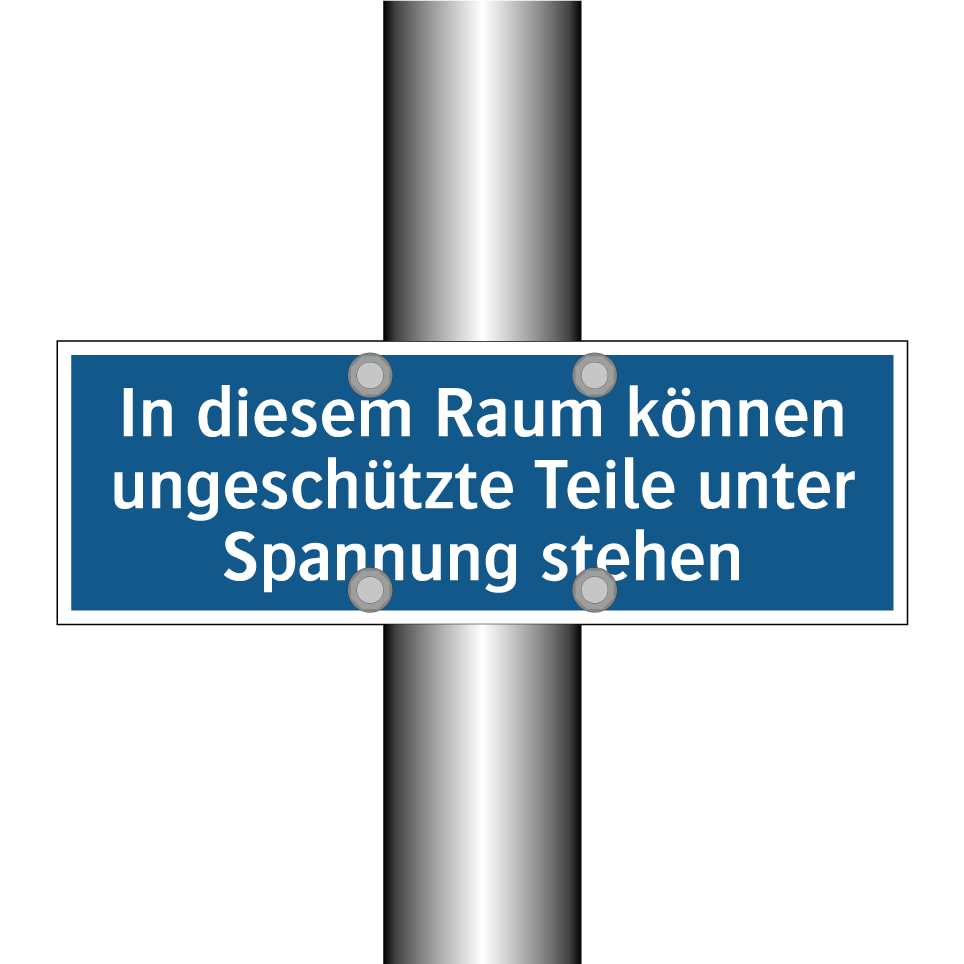 Gebotsschild mit dem Text In diesem Raum können ungeschützte Teile unter Spannung stehen
