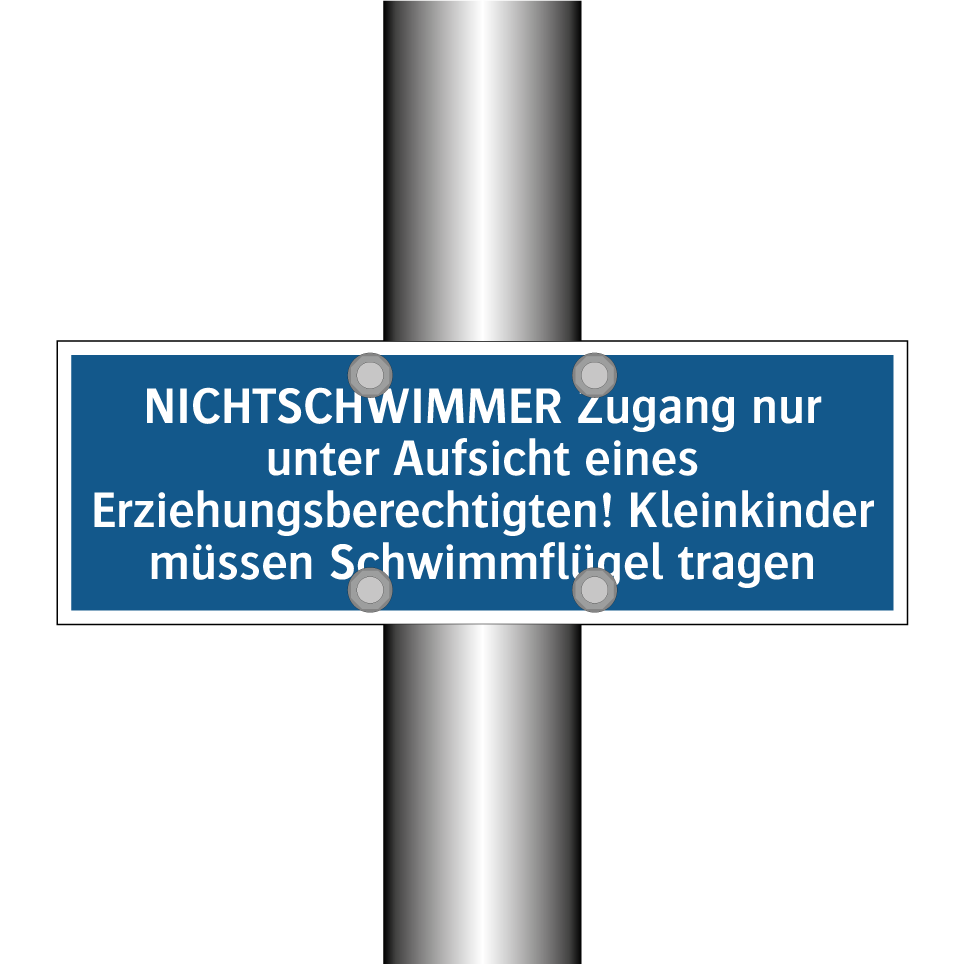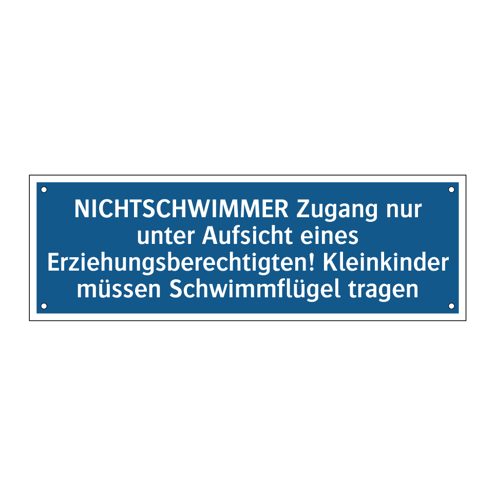 Gebotsschild mit dem Text NICHTSCHWIMMER Zugang nur unter Aufsicht eines Erziehungsberechtigten! Kleinkinder müssen Schwimmflügel tragen
