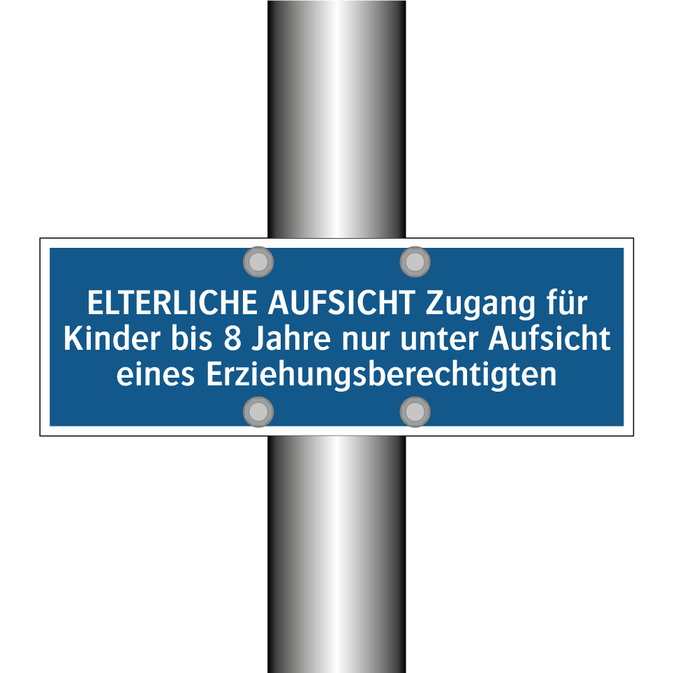 Gebotsschild mit dem Text ELTERLICHE AUFSICHT Zugang für Kinder bis 8 Jahre nur unter Aufsicht eines Erziehungsberechtigten