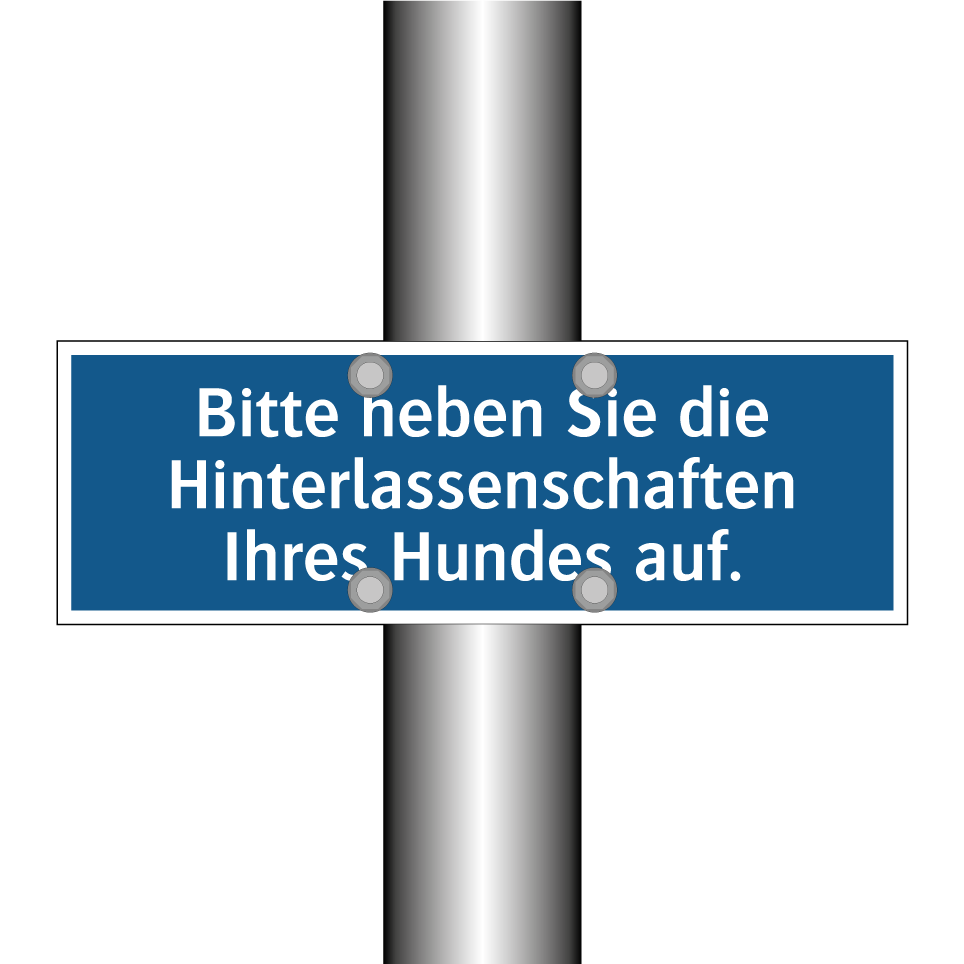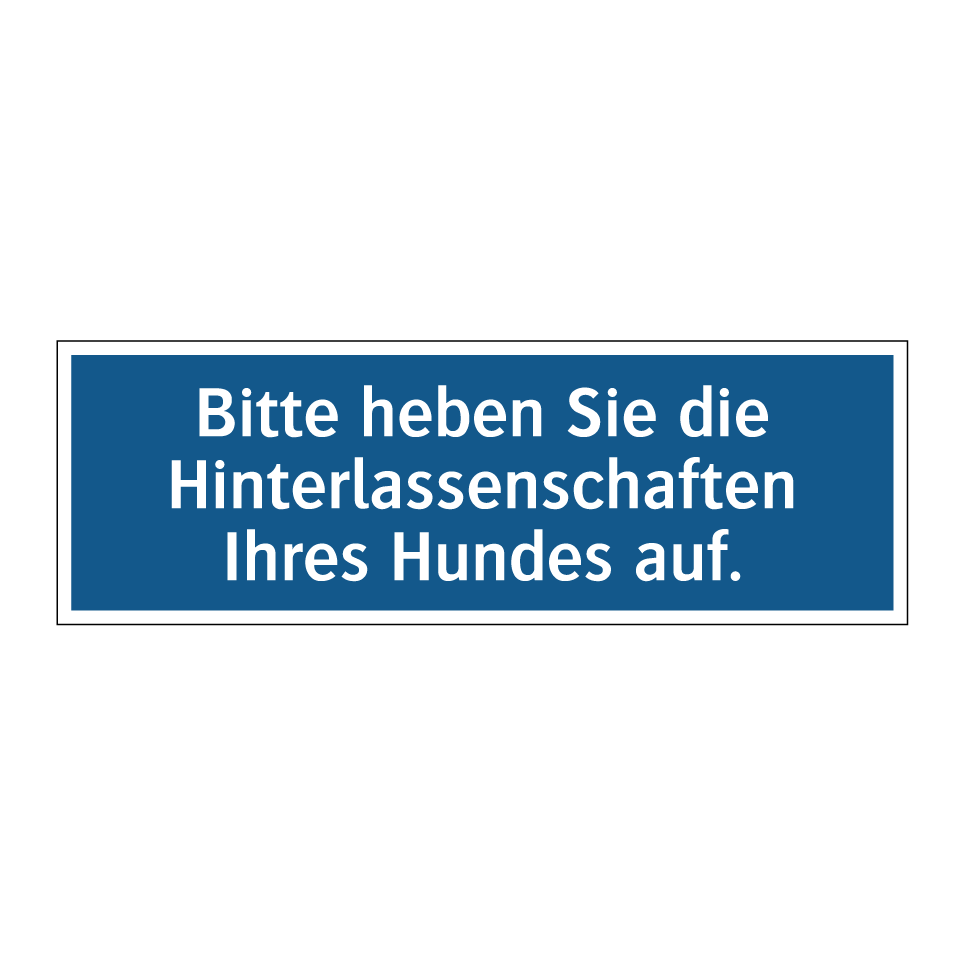 Diese Gebotsschild ist ideal für den Einsatz in öffentlichen Parks, Wohngebieten oder auf Gehwegen, wo Hundebesitzer regelmäßig mit ihren Haustieren unterwegs sind. Sie dient dazu, die Sauberkeit und Hygiene in der Umgebung zu fördern, indem sie die Menschen daran erinnert, die Hinterlassenschaften ihrer Hunde zu beseitigen. Die auffällige blaue Hintergrundfarbe mit weißer Schrift sorgt dafür, dass die Botschaft klar und deutlich wahrgenommen wird. Platzieren Sie diese Gebotsschild an strategischen Punkten, um die Einhaltung der Regeln zu gewährleisten und eine saubere, angenehme Umgebung für alle zu schaffen. Ein unverzichtbares Element für jede hundefreundliche Gemeinschaft.
