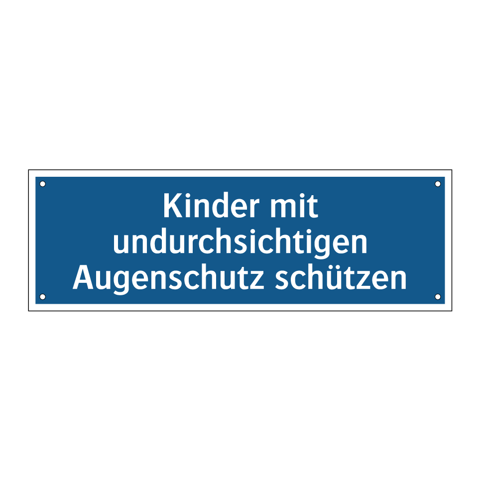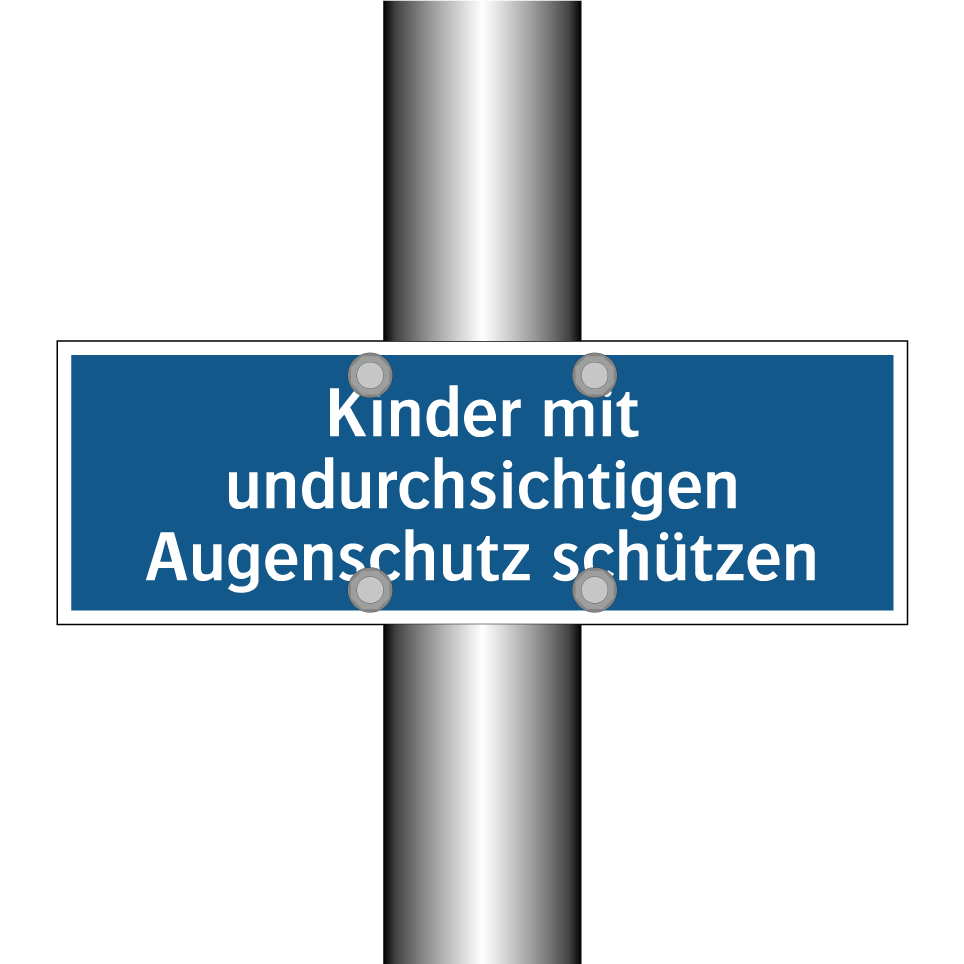 Gebotsschild mit dem Text Kinder mit undurchsichtigen Augenschutz schützen