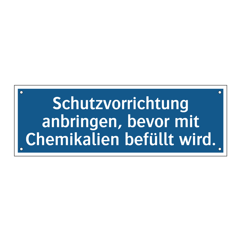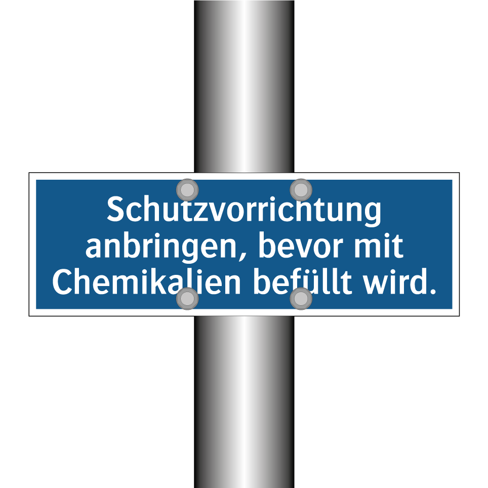 Gebotsschild mit dem Text Schutzvorrichtung anbringen, bevor mit Chemikalien befüllt wird.