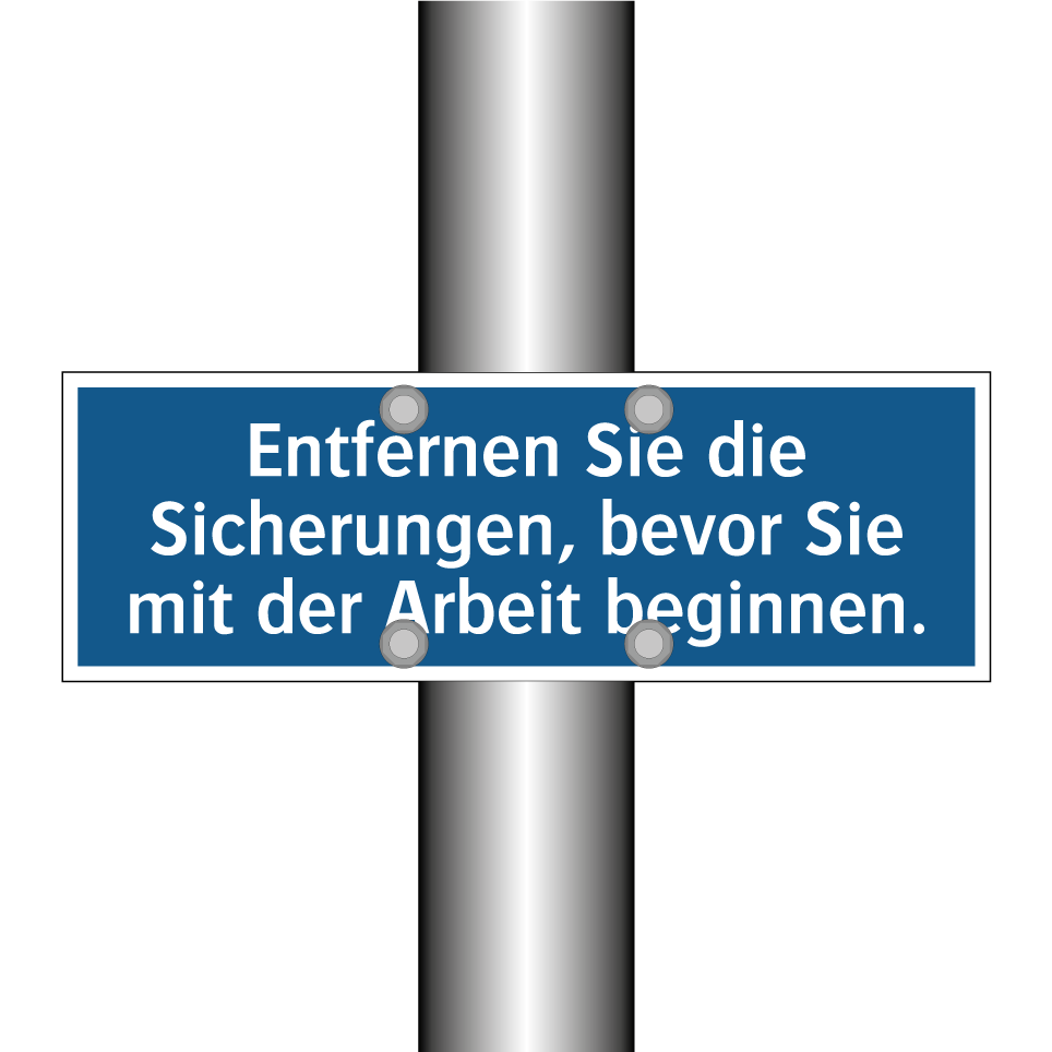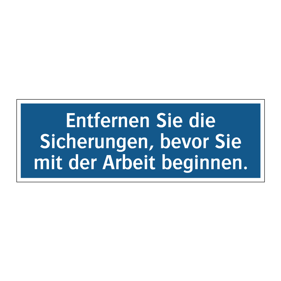 Diese Gebotsschild ist ein unverzichtbares Element für die Sicherheit am Arbeitsplatz. Sie erinnert daran, wichtige Sicherheitsmaßnahmen zu ergreifen, bevor mit der Arbeit begonnen wird. Ideal für industrielle Umgebungen, Werkstätten oder Baustellen, wo das Entfernen von Sicherungen vor Arbeitsbeginn entscheidend ist. Diese Hinweistafel kann an gut sichtbaren Stellen wie Eingängen, Maschinenräumen oder in der Nähe von Schaltkästen angebracht werden, um sicherzustellen, dass alle Mitarbeiter die notwendigen Vorsichtsmaßnahmen treffen. Durch die klare blaue Hintergrundfarbe und den kontrastreichen weißen Text wird die Botschaft effektiv vermittelt und trägt zur Vermeidung von Unfällen bei.