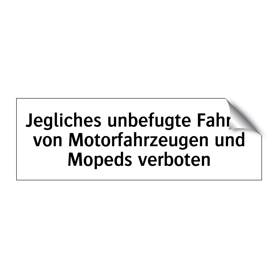 Verbotsschild mit dem Text Jegliches unbefugte Fahren von Motorfahrzeugen und Mopeds verboten