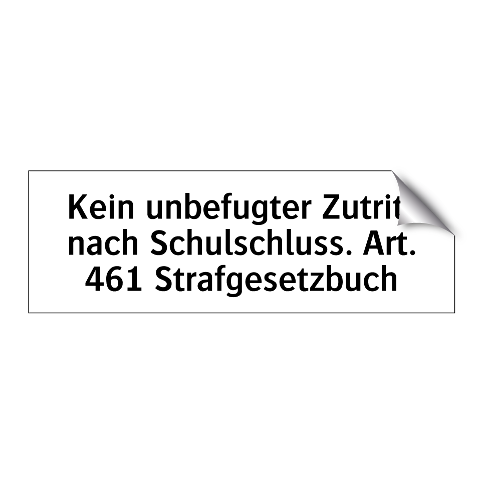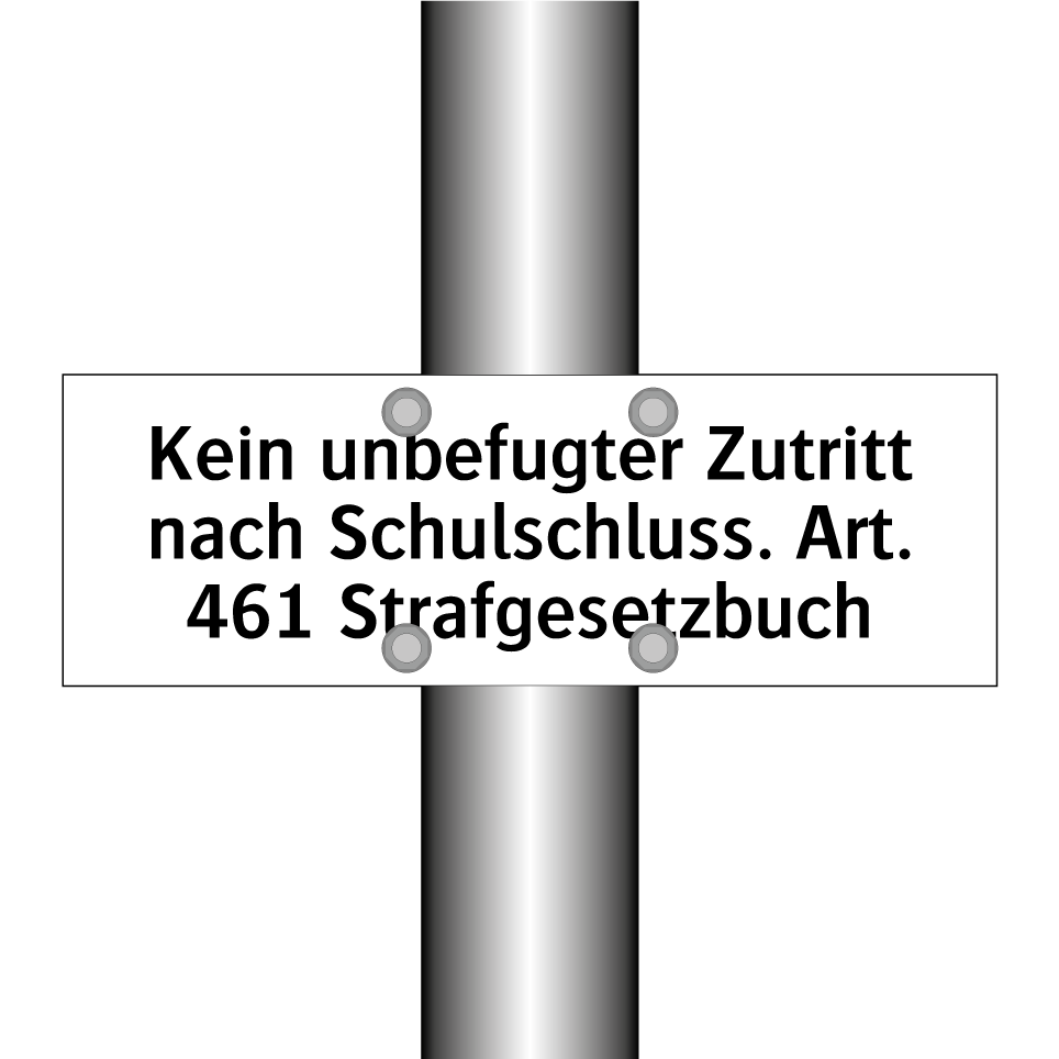 Verbotsschild mit dem Text Kein unbefugter Zutritt nach Schulschluss. Art. 461 Strafgesetzbuch