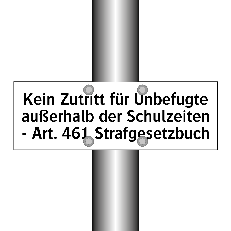Verbotsschild mit dem Text Kein Zutritt für Unbefugte außerhalb der Schulzeiten - Art. 461 Strafgesetzbuch