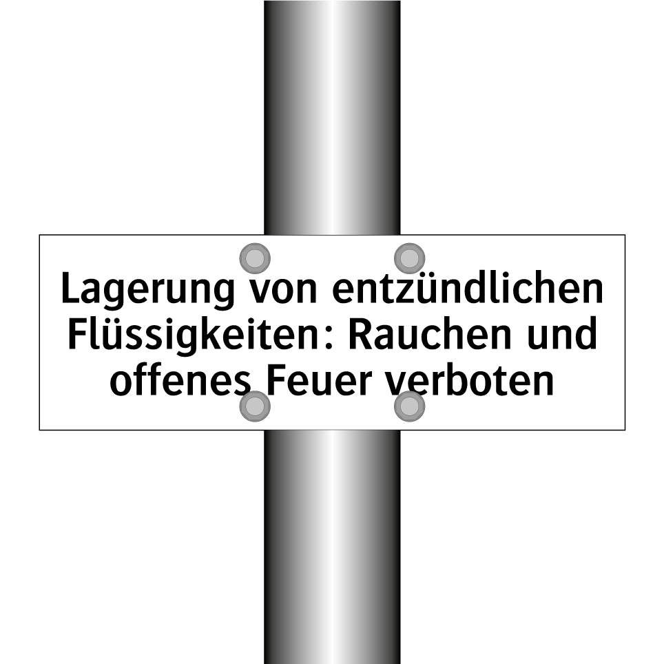 Verbotsschild mit dem Text Lagerung von entzündlichen Flüssigkeiten: Rauchen und offenes Feuer verboten