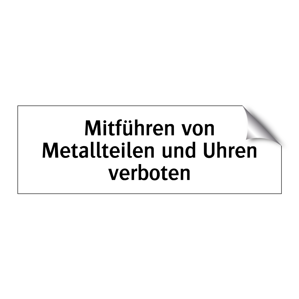Verbotsschild mit dem Text Mitführen von Metallteilen und Uhren verboten