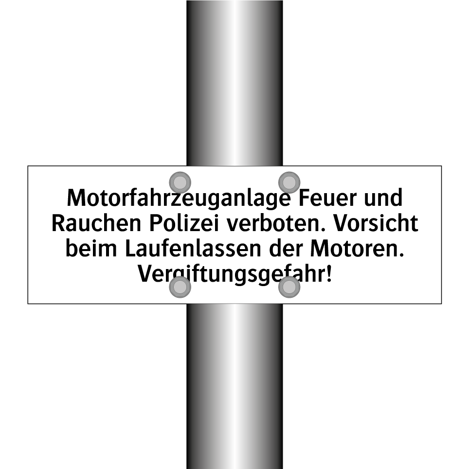 Verbotsschild mit dem Text Motorfahrzeuganlage Feuer und Rauchen Polizei verboten. Vorsicht beim Laufenlassen der Motoren. Vergiftungsgefahr!