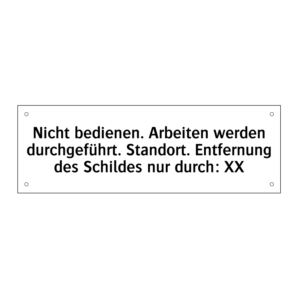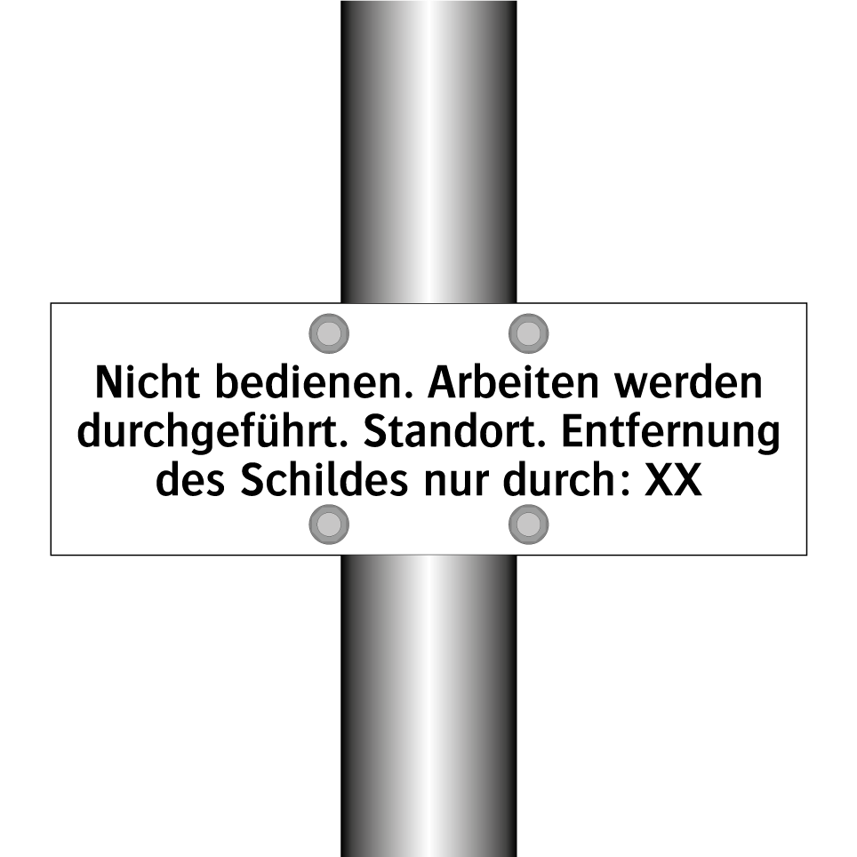 Verbotsschild mit dem Text Nicht bedienen. Arbeiten werden durchgeführt. Standort. Entfernung des Schildes nur durch: XX