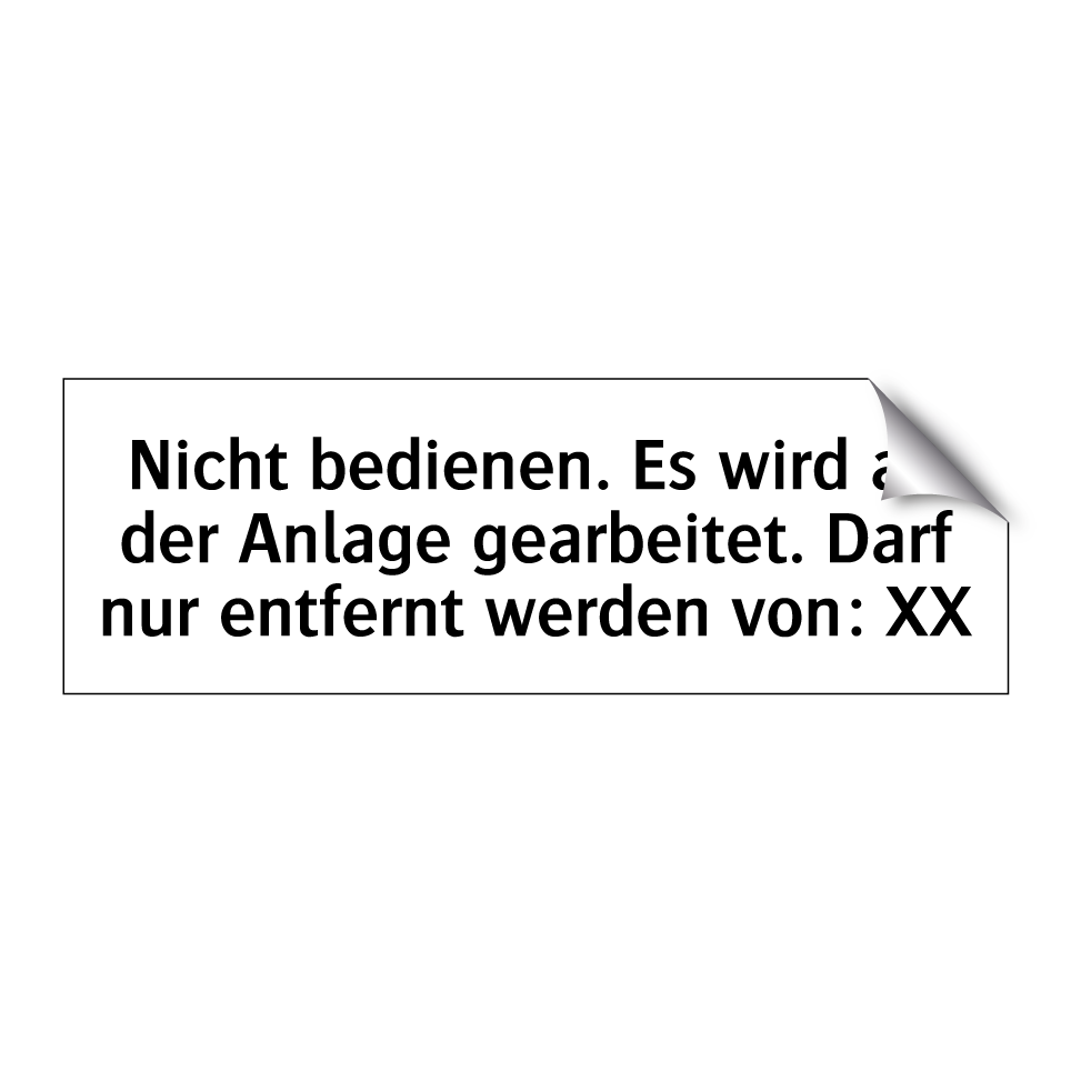 Verbotsschild mit dem Text Nicht bedienen. Es wird an der Anlage gearbeitet. Darf nur entfernt werden von: XX
