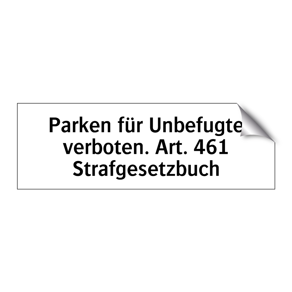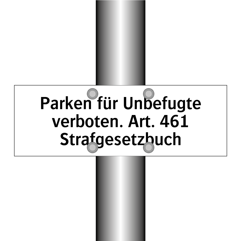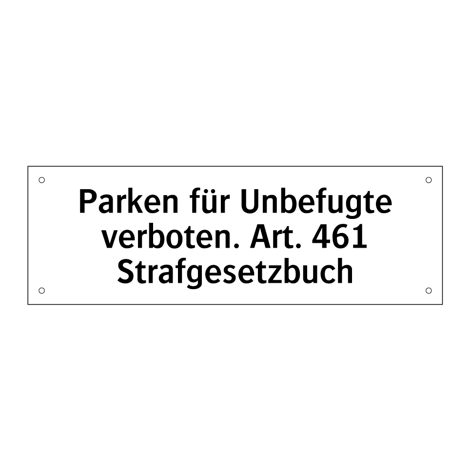 Verbotsschild mit dem Text Parken für Unbefugte verboten. Art. 461 Strafgesetzbuch