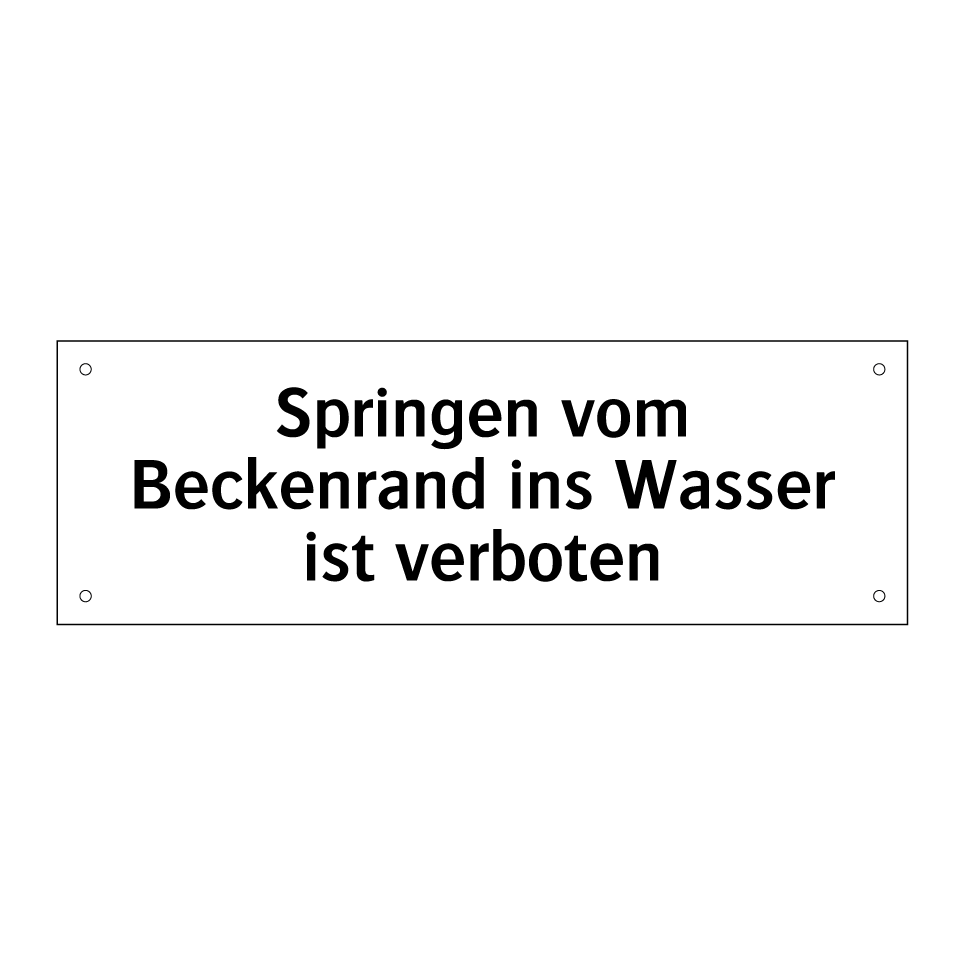 Diese Verbotsschild ist ideal für Schwimmbäder und Freizeiteinrichtungen, um die Sicherheit der Badegäste zu gewährleisten. Sie erinnert daran, dass das Springen vom Beckenrand untersagt ist, um Unfälle und Verletzungen zu vermeiden. Platzieren Sie diese deutliche Warnung an gut sichtbaren Stellen rund um den Poolbereich, um sicherzustellen, dass alle Besucher die Regeln einhalten. Diese klare und prägnante Botschaft hilft, ein sicheres Umfeld zu schaffen und die Einhaltung der Vorschriften zu fördern. Perfekt für öffentliche Schwimmbäder, Hotelpools oder private Schwimmbereiche, um die Sicherheit aller zu gewährleisten.