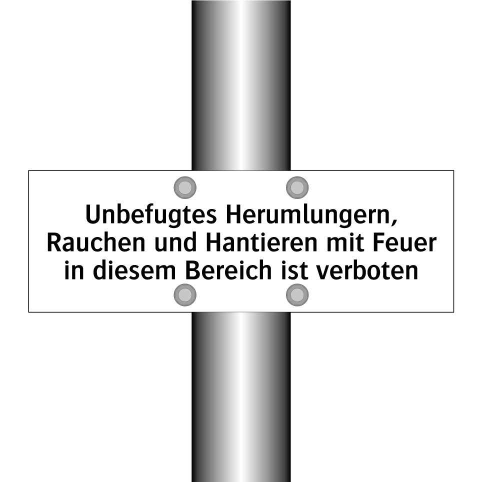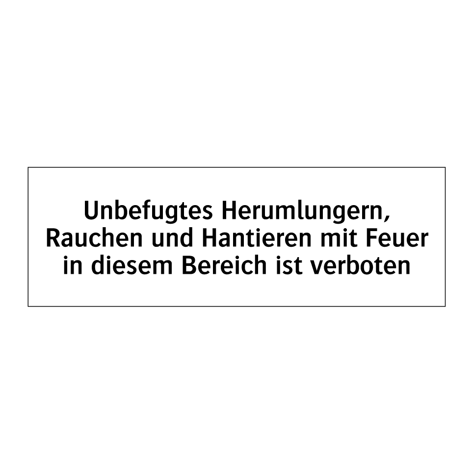 Verbotsschild mit dem Text Unbefugtes Herumlungern, Rauchen und Hantieren mit Feuer in diesem Bereich ist verboten